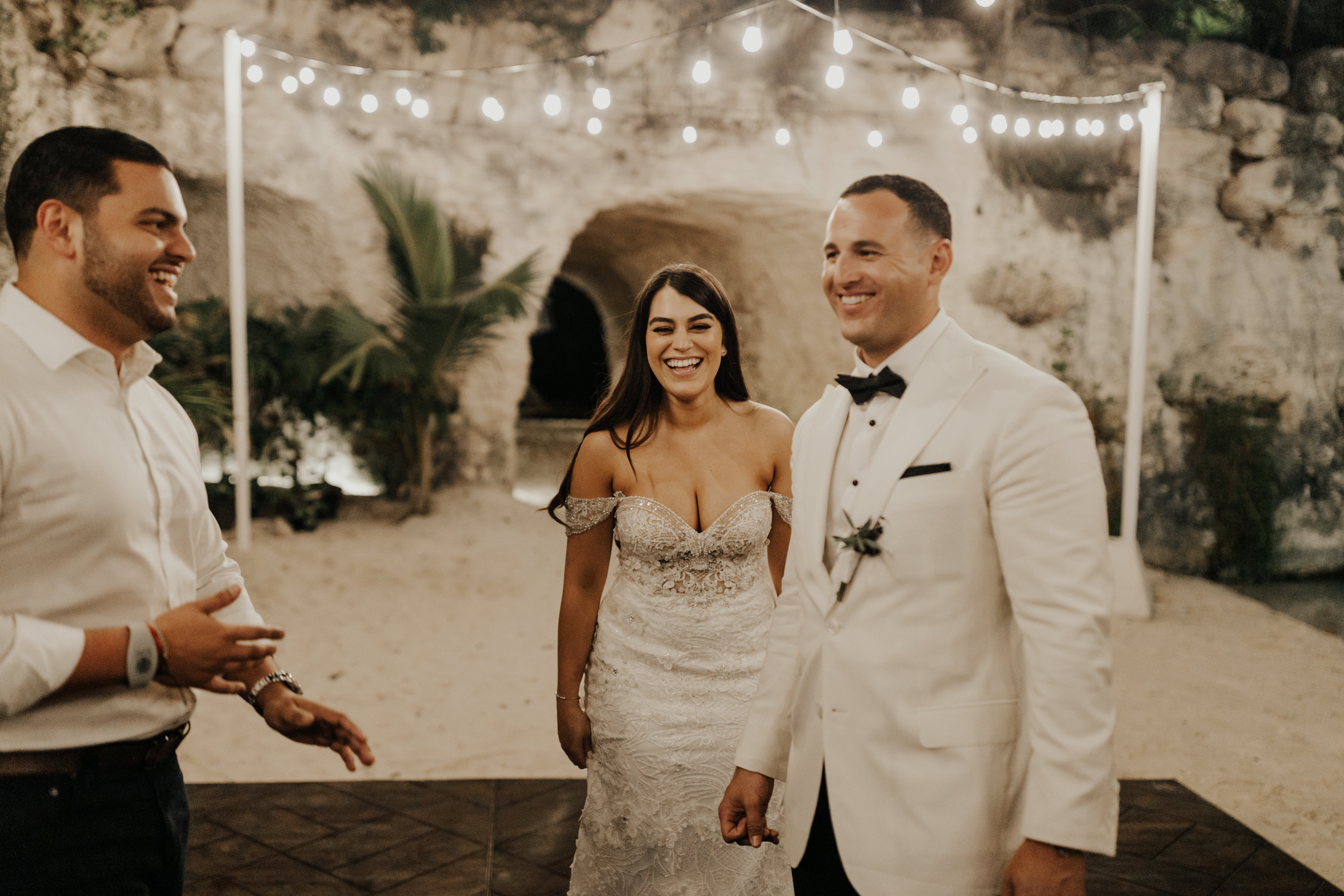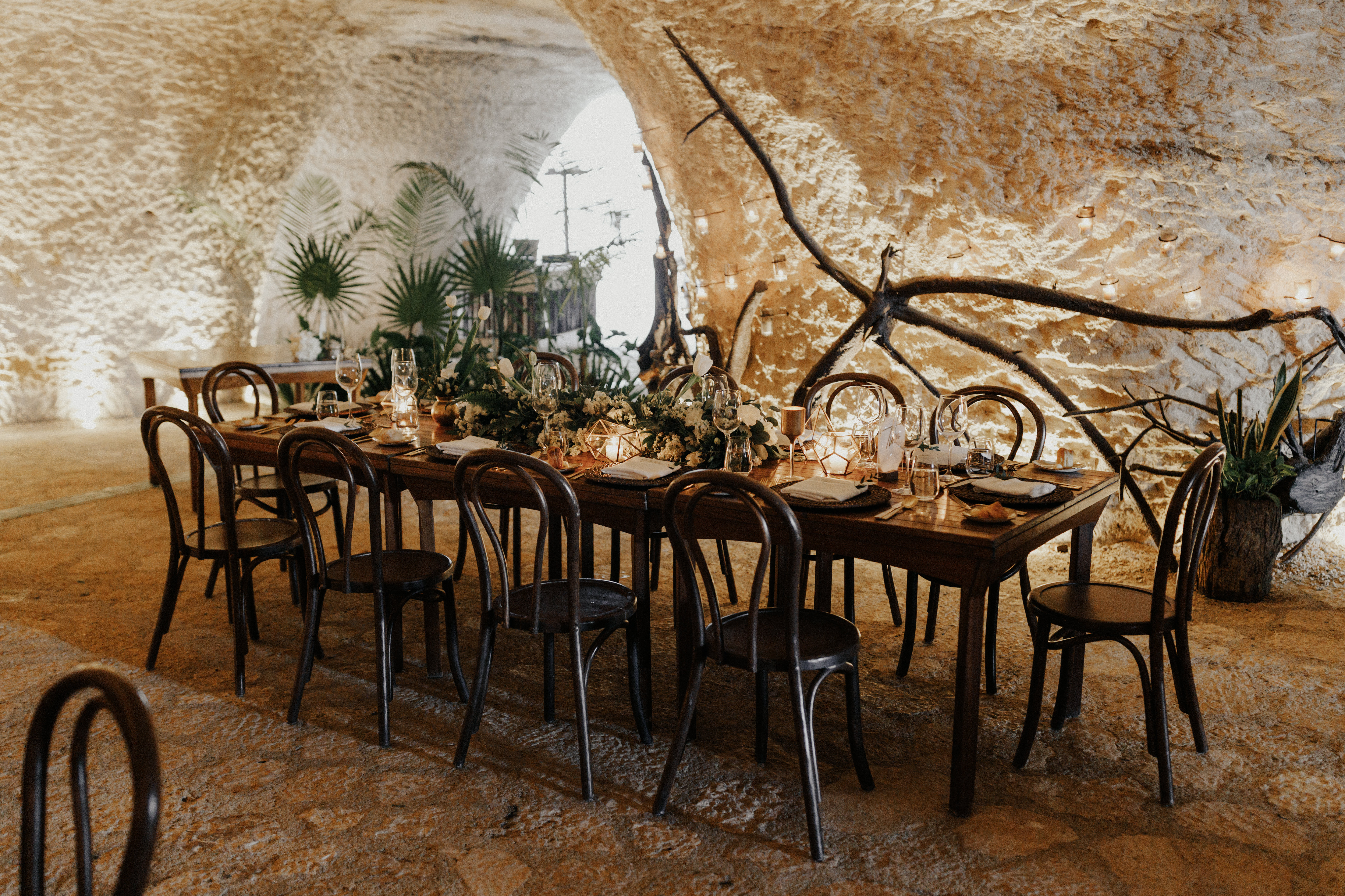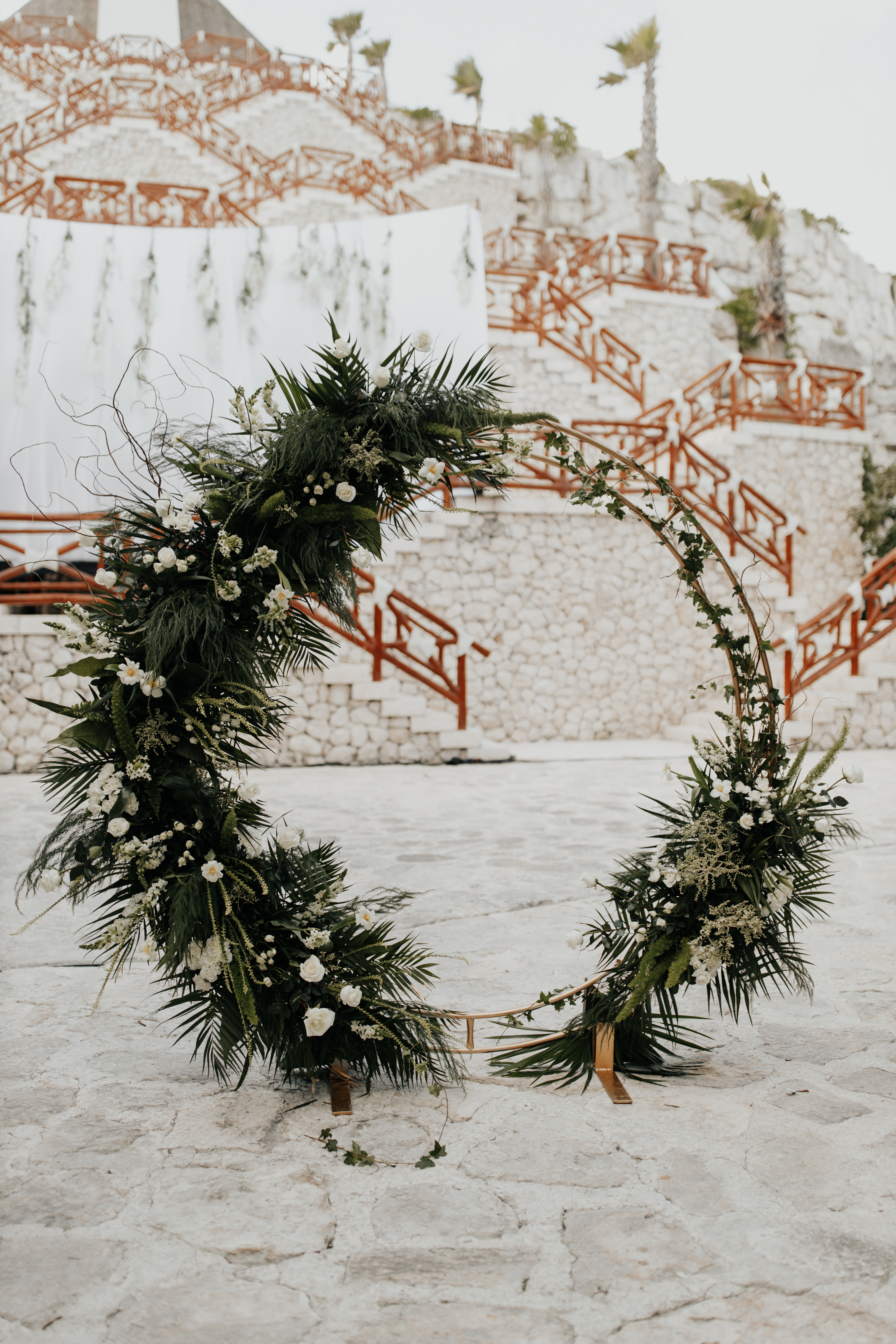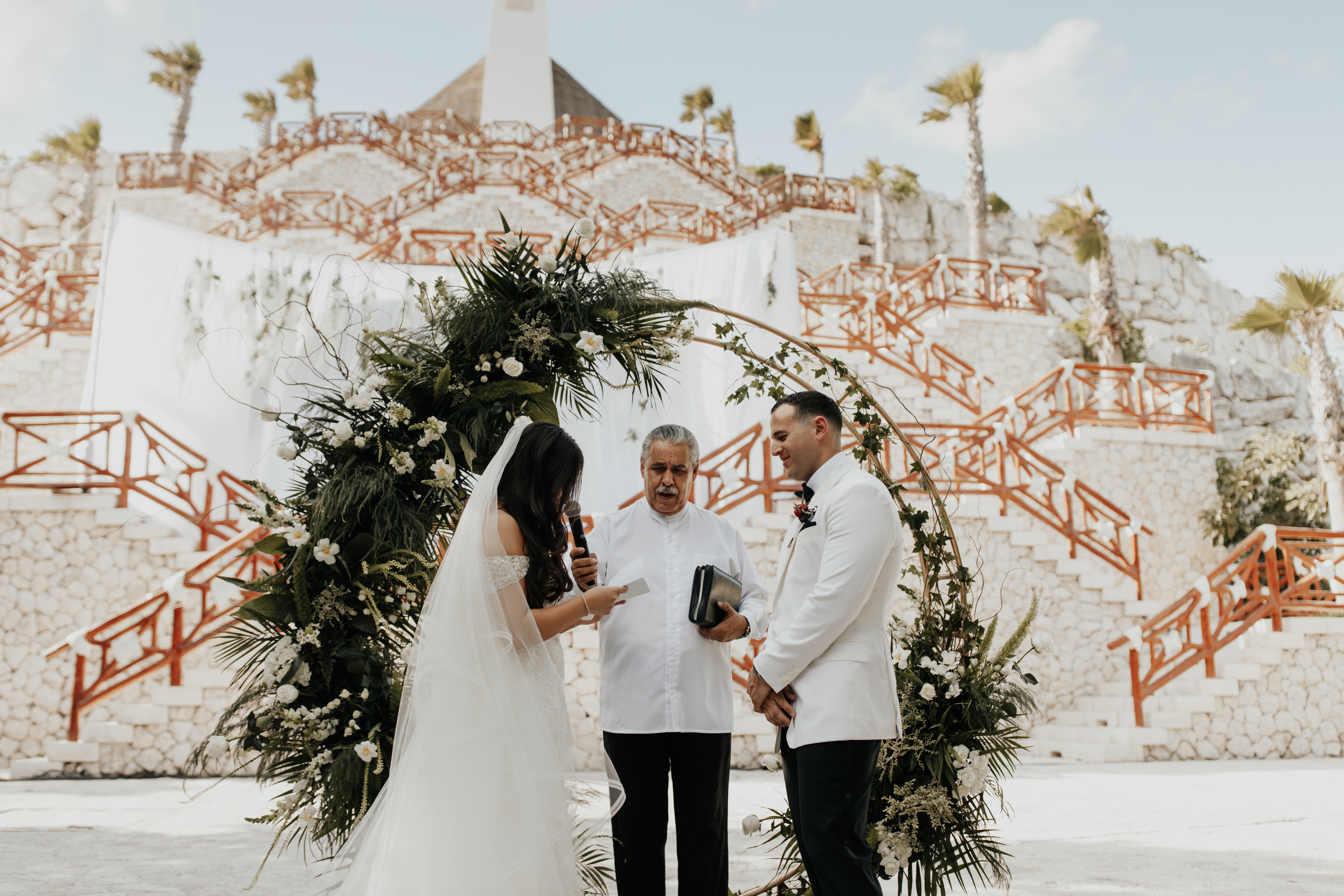 Al llegar el gran día, nuestra novia optó por llevar su cabello suelto en ondas, maquilla y peinado por Tania Tagle; y el estilo que le dio a la boda fue un toque tropical con estilo romántico que combinaba perfectamente con la ceremonia en la bella Xplanada Xpiral de piedra de pirámide y los toques de calidez en la deslumbrante recepción en Cuevitas.