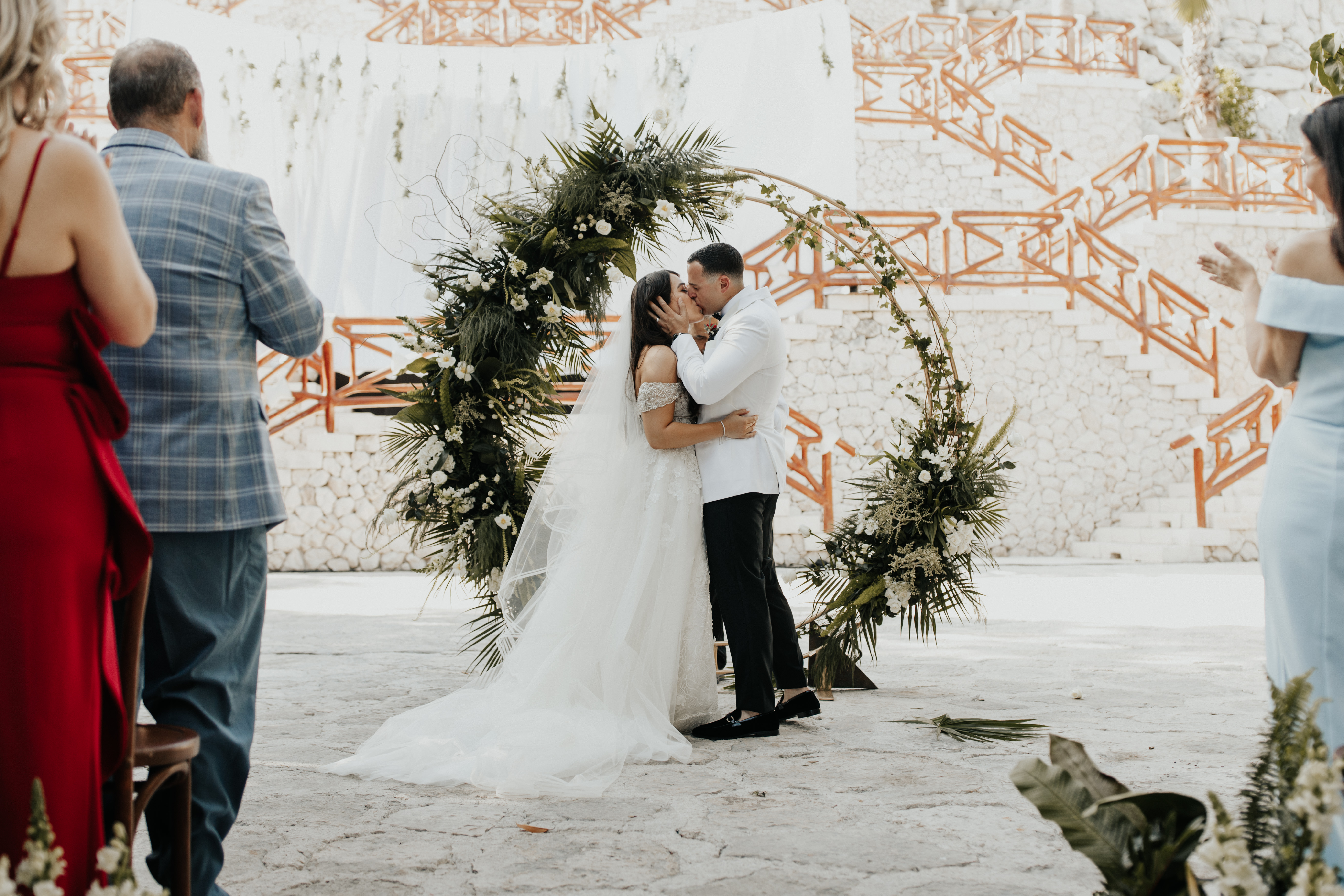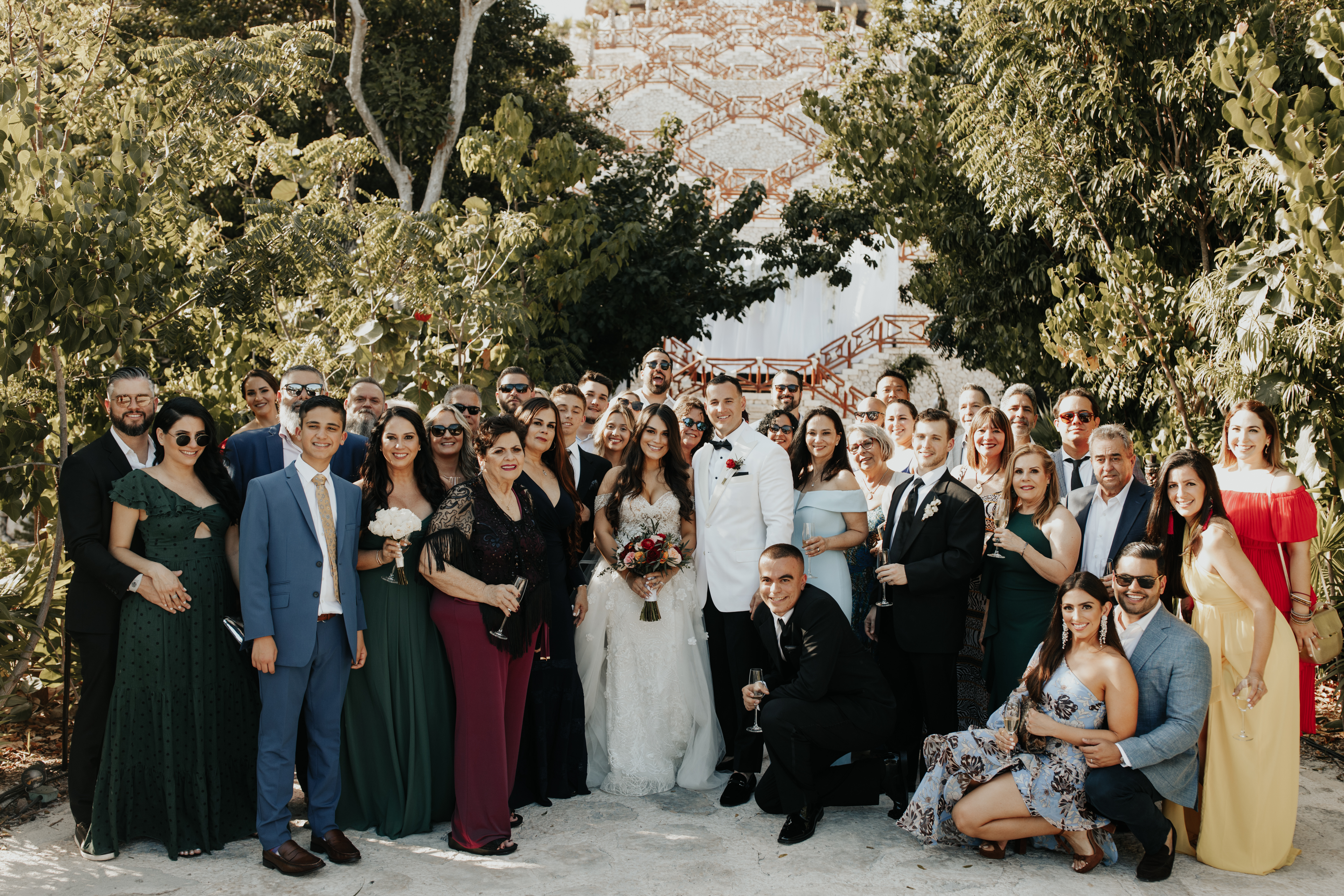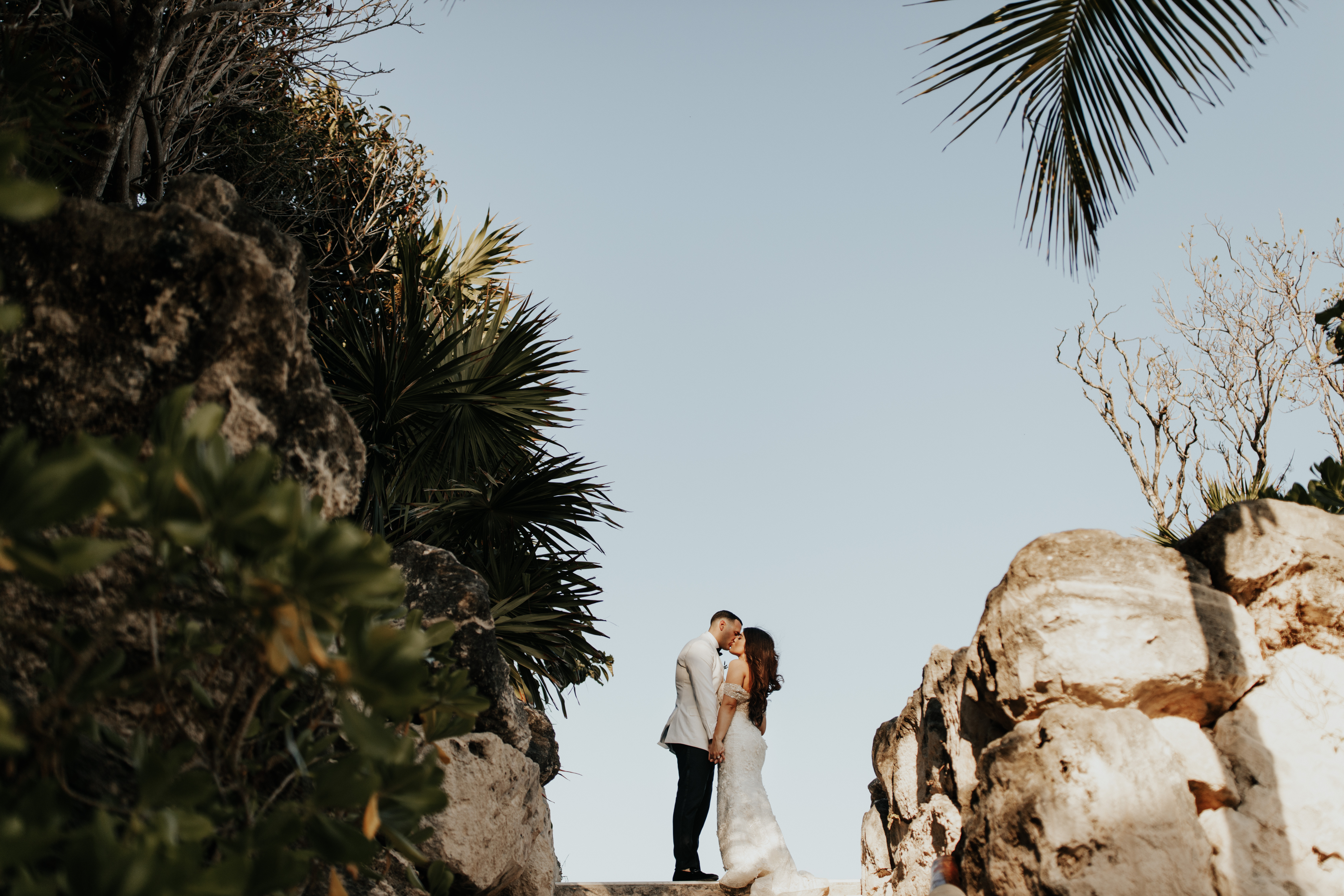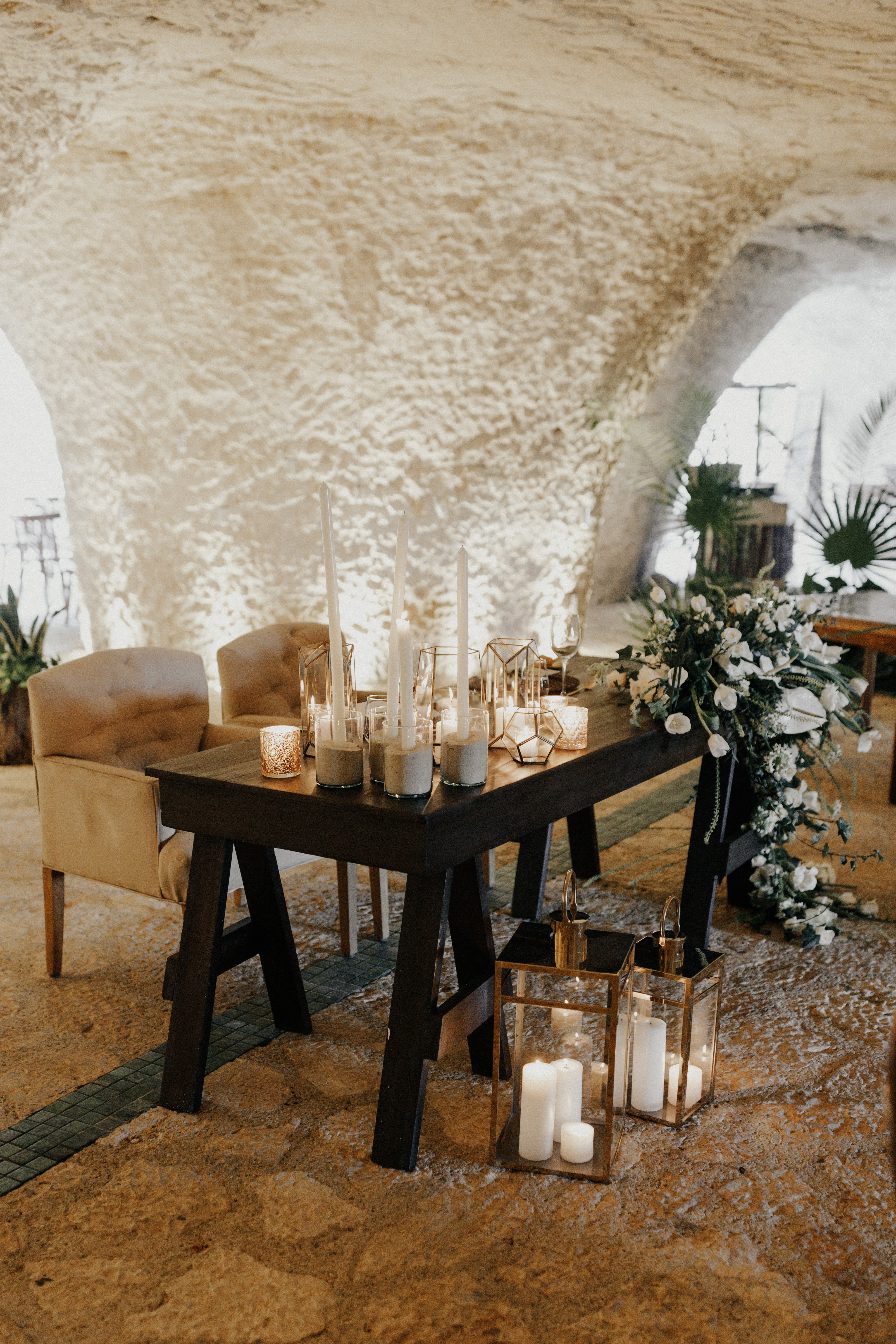 Al llegar el gran día, nuestra novia optó por llevar su cabello suelto en ondas, maquilla y peinado por Tania Tagle; y el estilo que le dio a la boda fue un toque tropical con estilo romántico que combinaba perfectamente con la ceremonia en la bella Xplanada Xpiral de piedra de pirámide y los toques de calidez en la deslumbrante recepción en Cuevitas.
