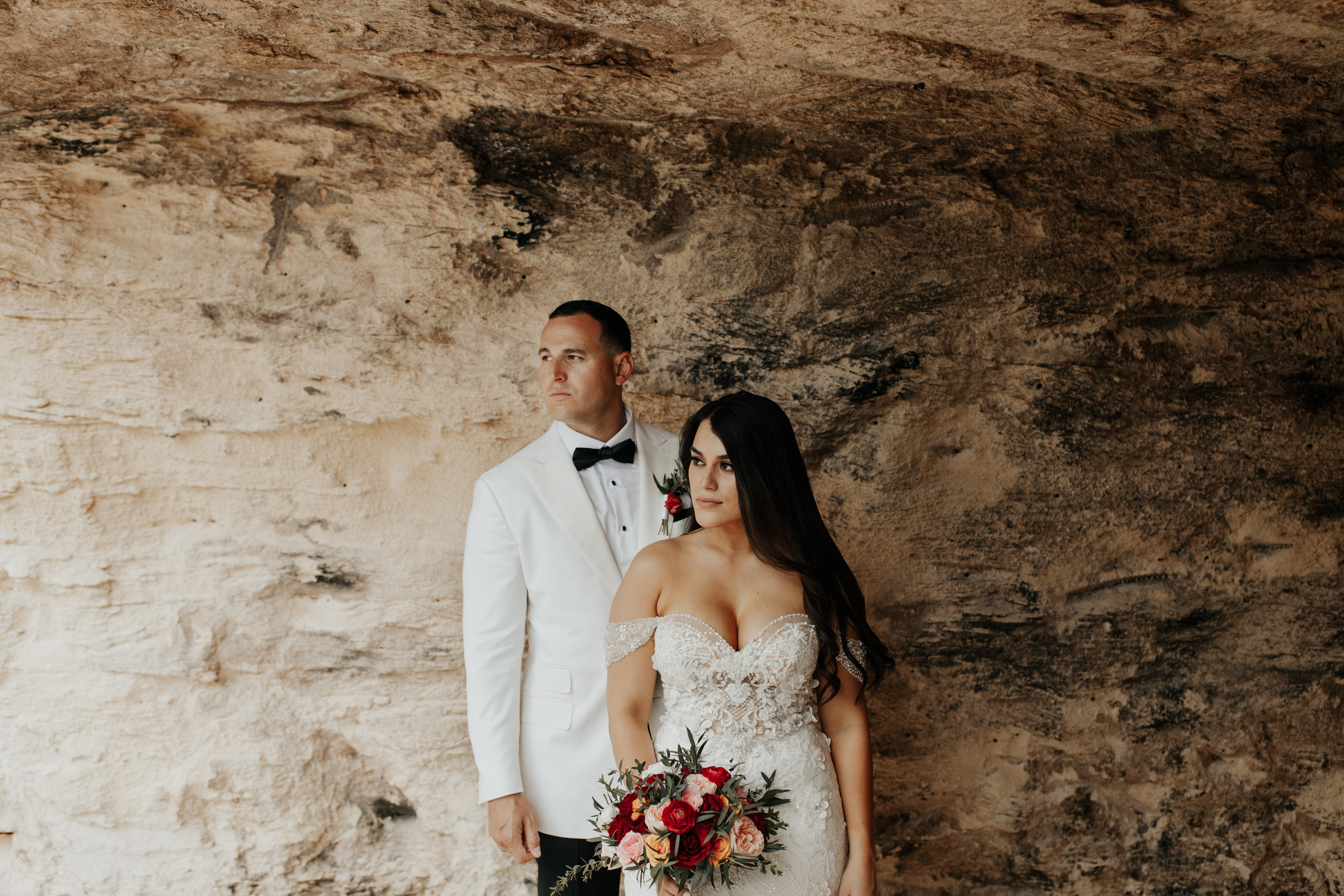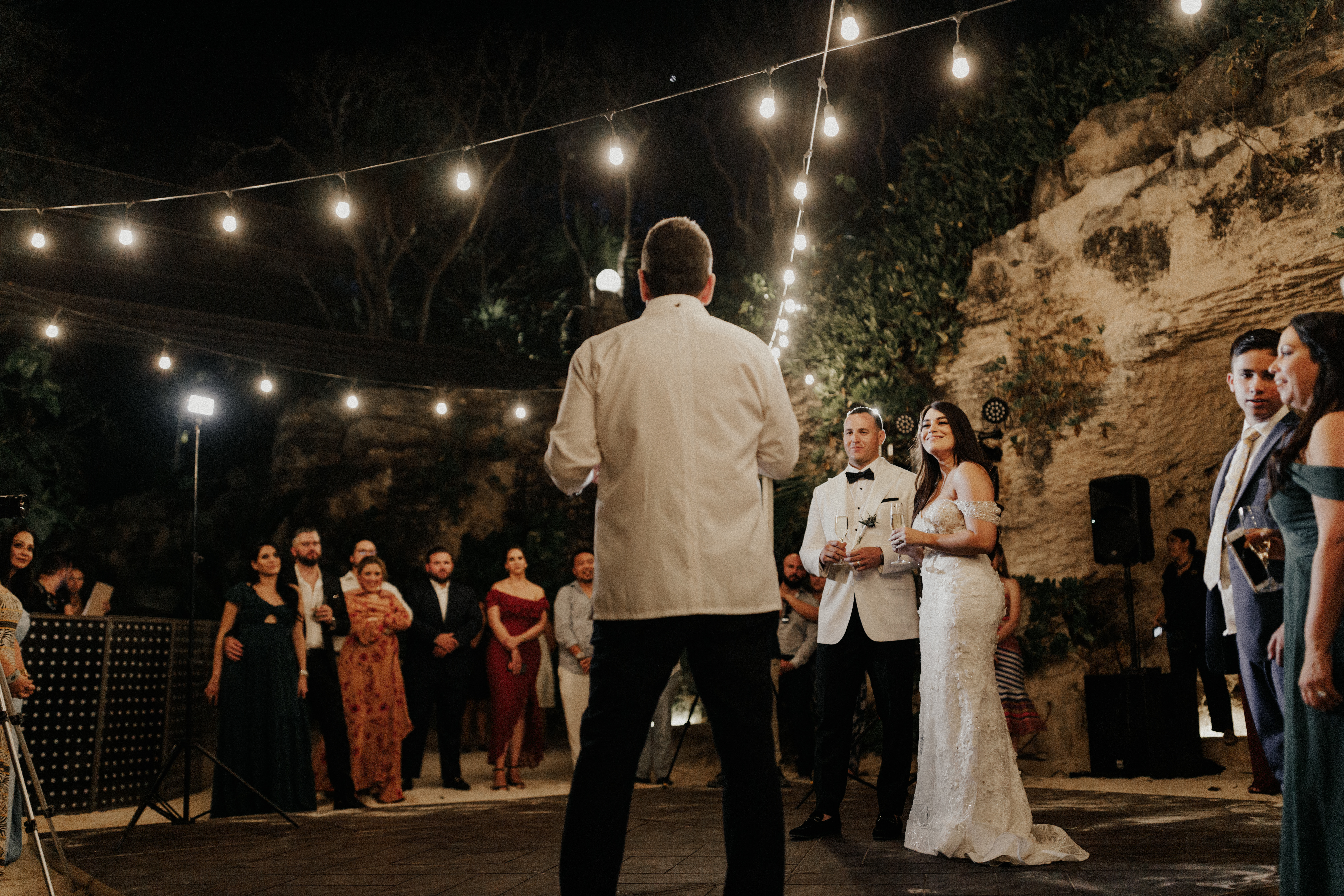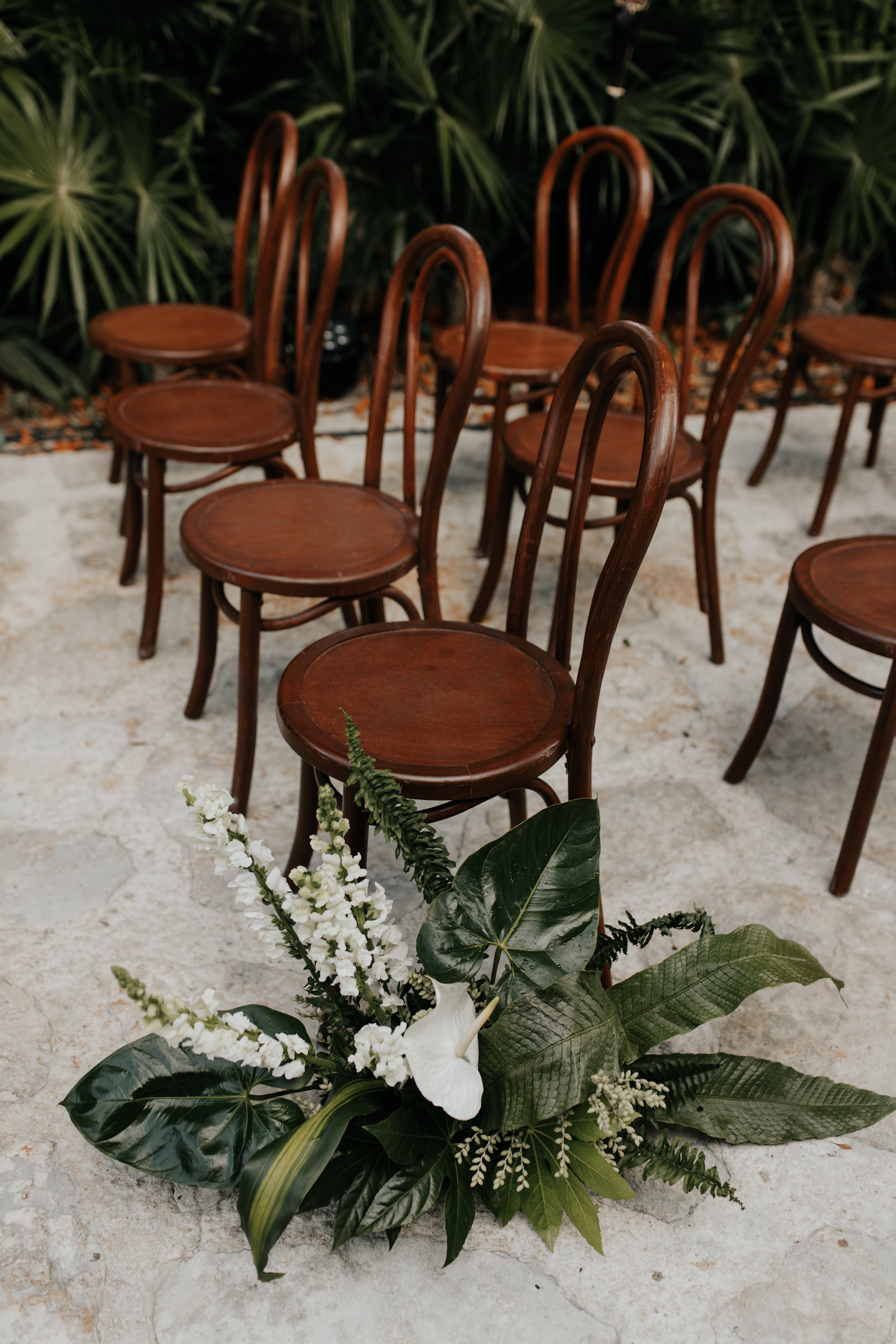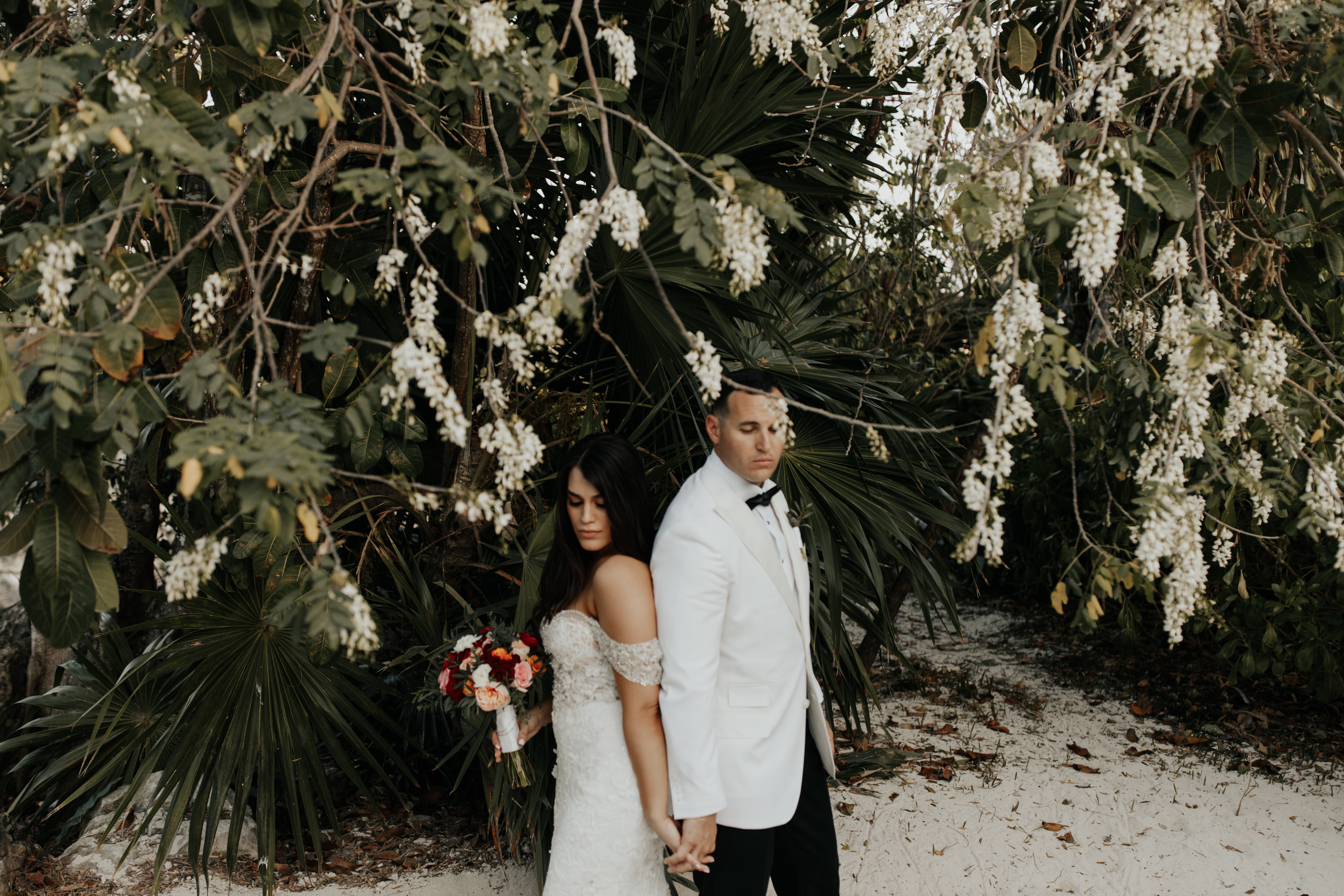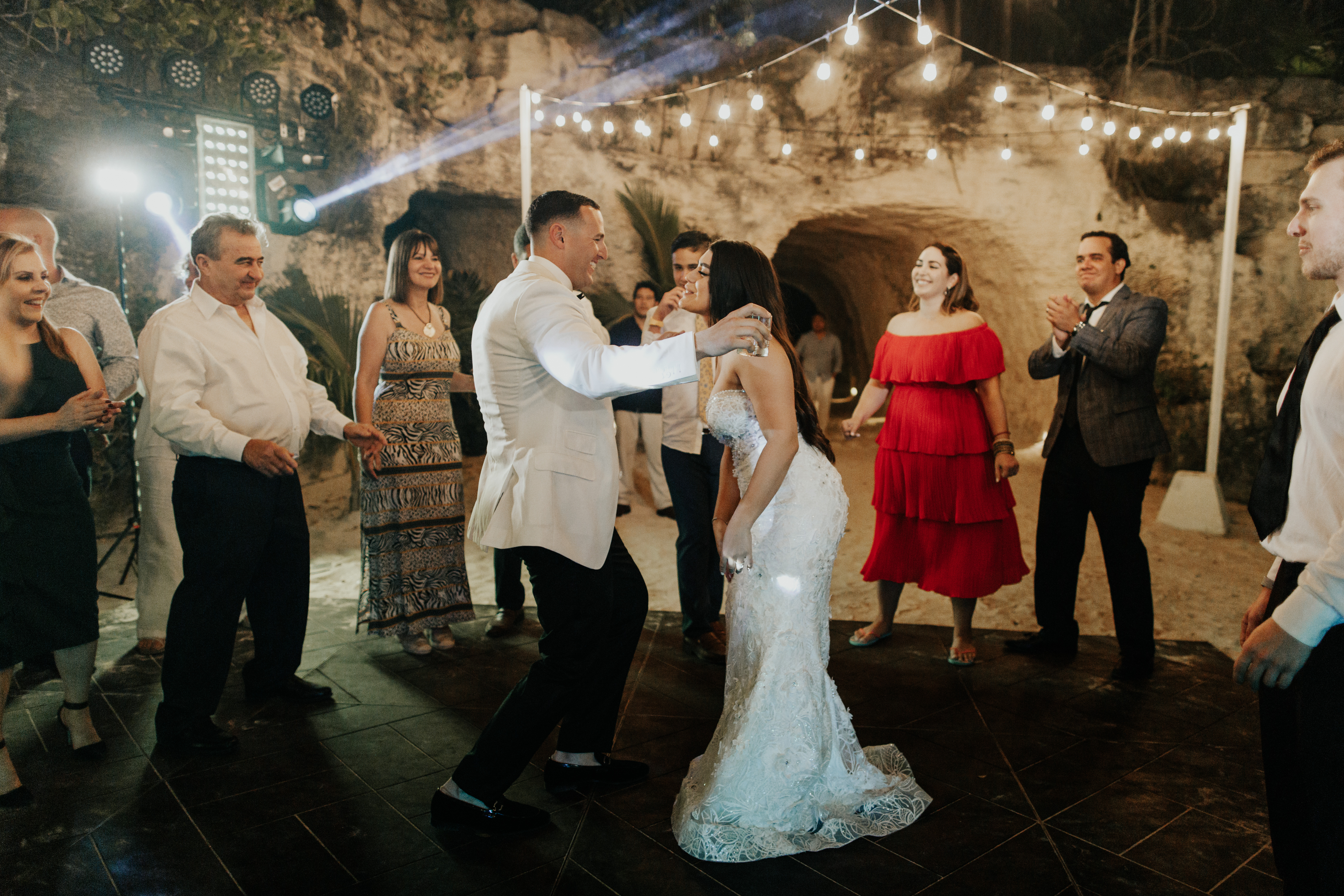 Al llegar el gran día, nuestra novia optó por llevar su cabello suelto en ondas, maquilla y peinado por Tania Tagle; y el estilo que le dio a la boda fue un toque tropical con estilo romántico que combinaba perfectamente con la ceremonia en la bella Xplanada Xpiral de piedra de pirámide y los toques de calidez en la deslumbrante recepción en Cuevitas.