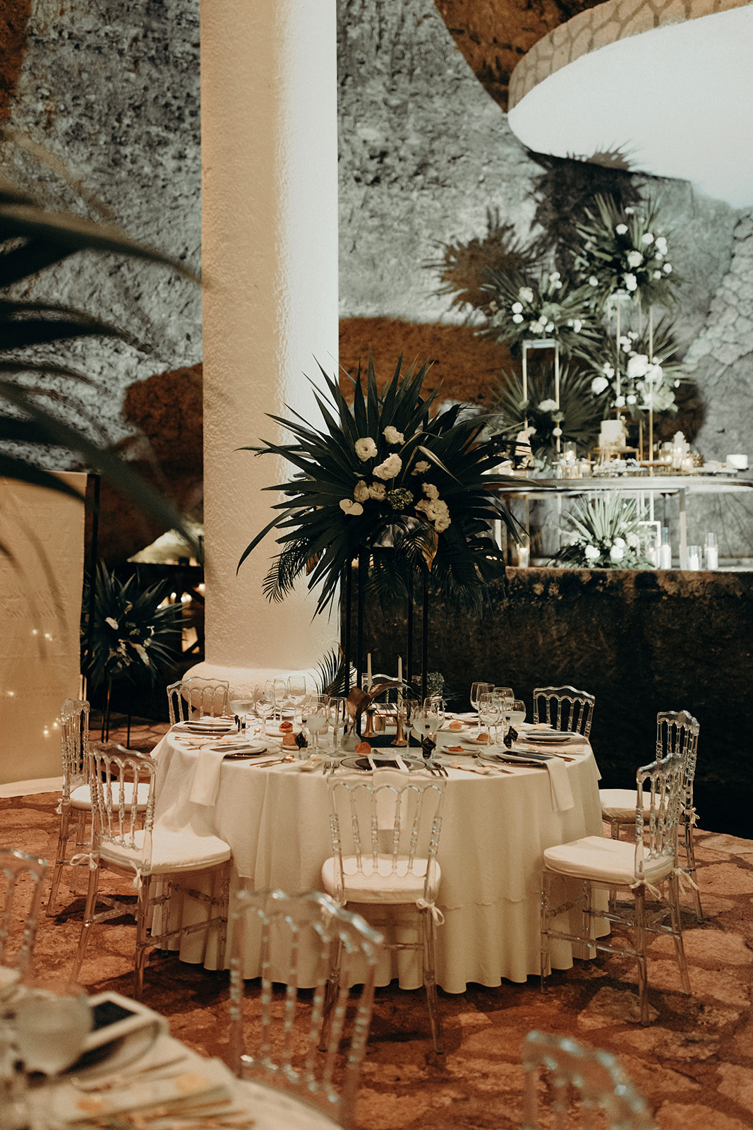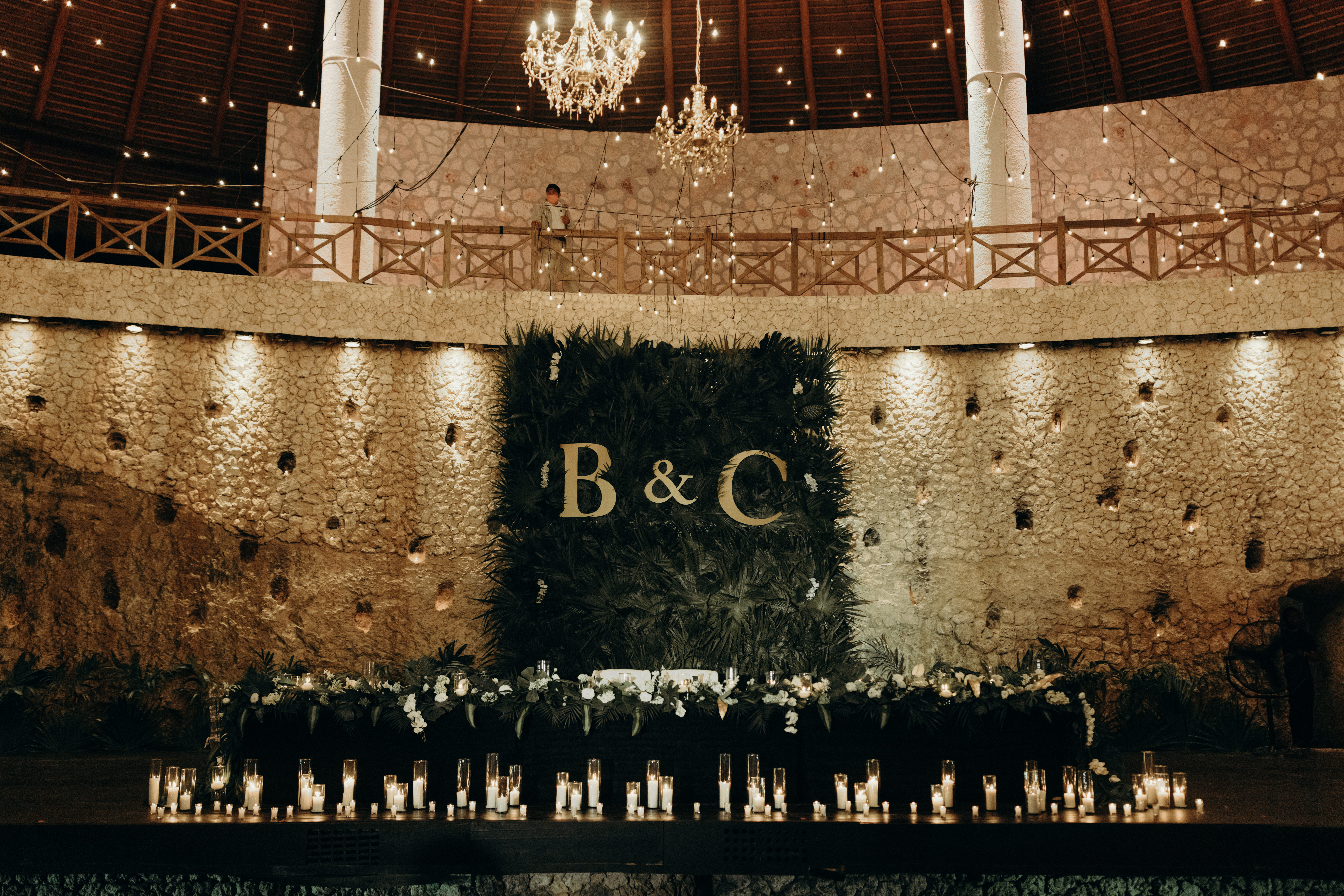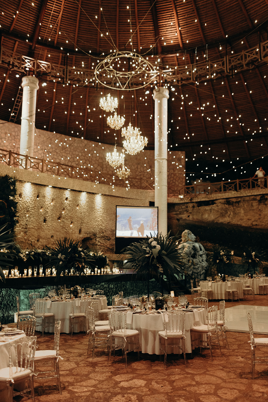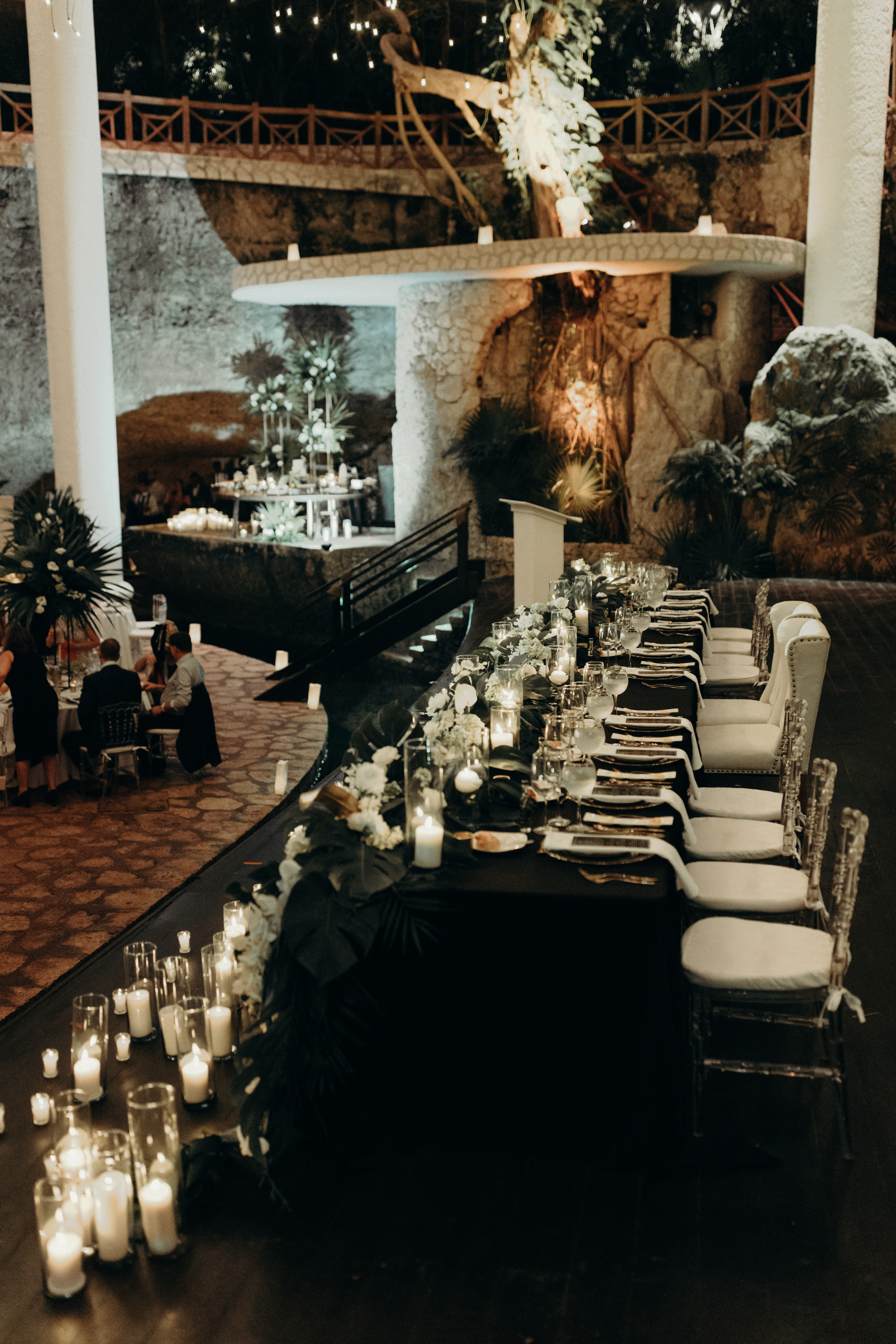 They have an amazing catholic ceremony in the top of the pyramid of the Hotel Xcaret Mexico at Todos Los Angeles Chapel, after the ceremony was finish they move the guests to Xcaret Park, at La Isla, a cave – river venue. The property have a spiral with a water and fire fountain that give the entrance to their guests, after the guests walk a glass bridge they see the break taking reception!