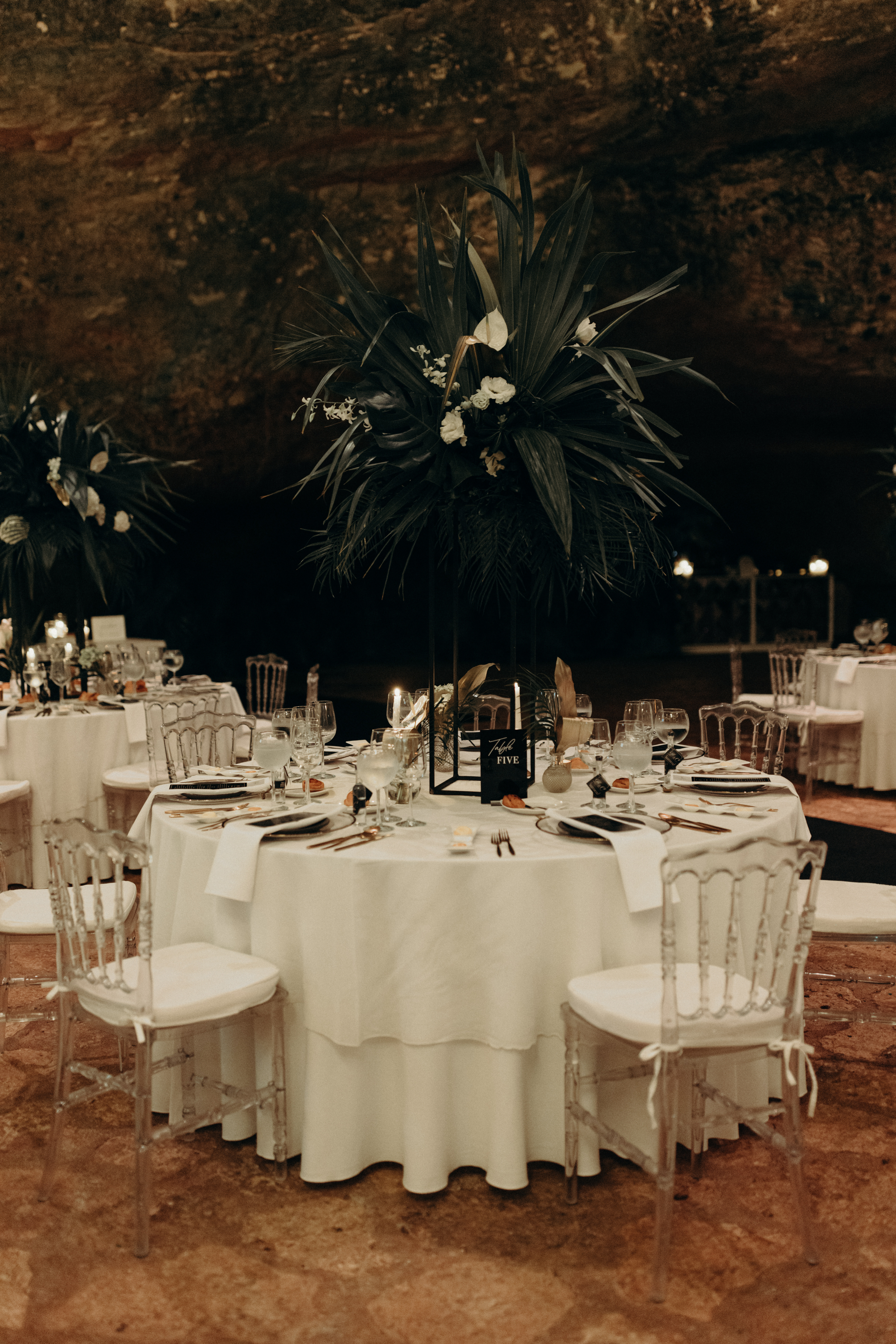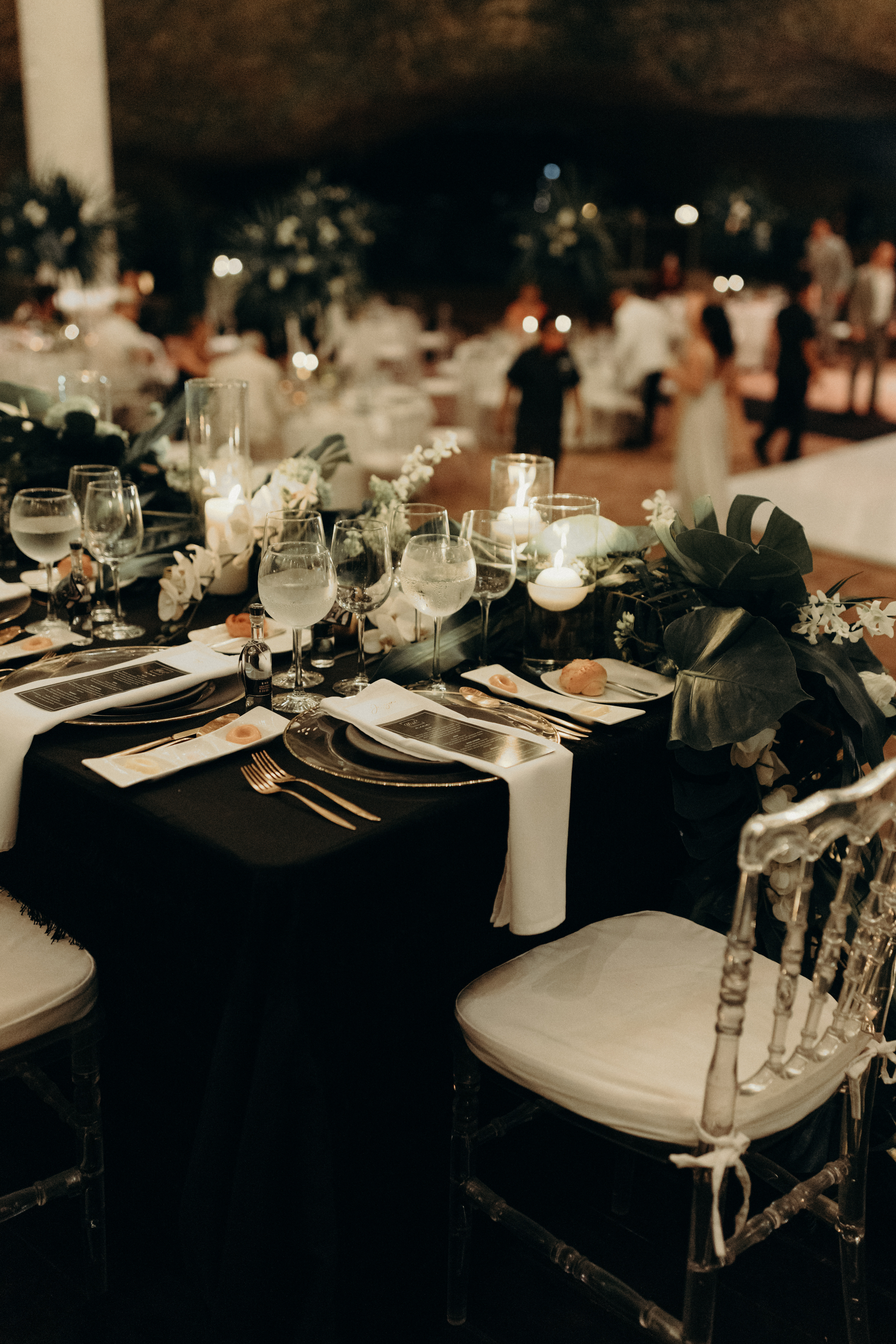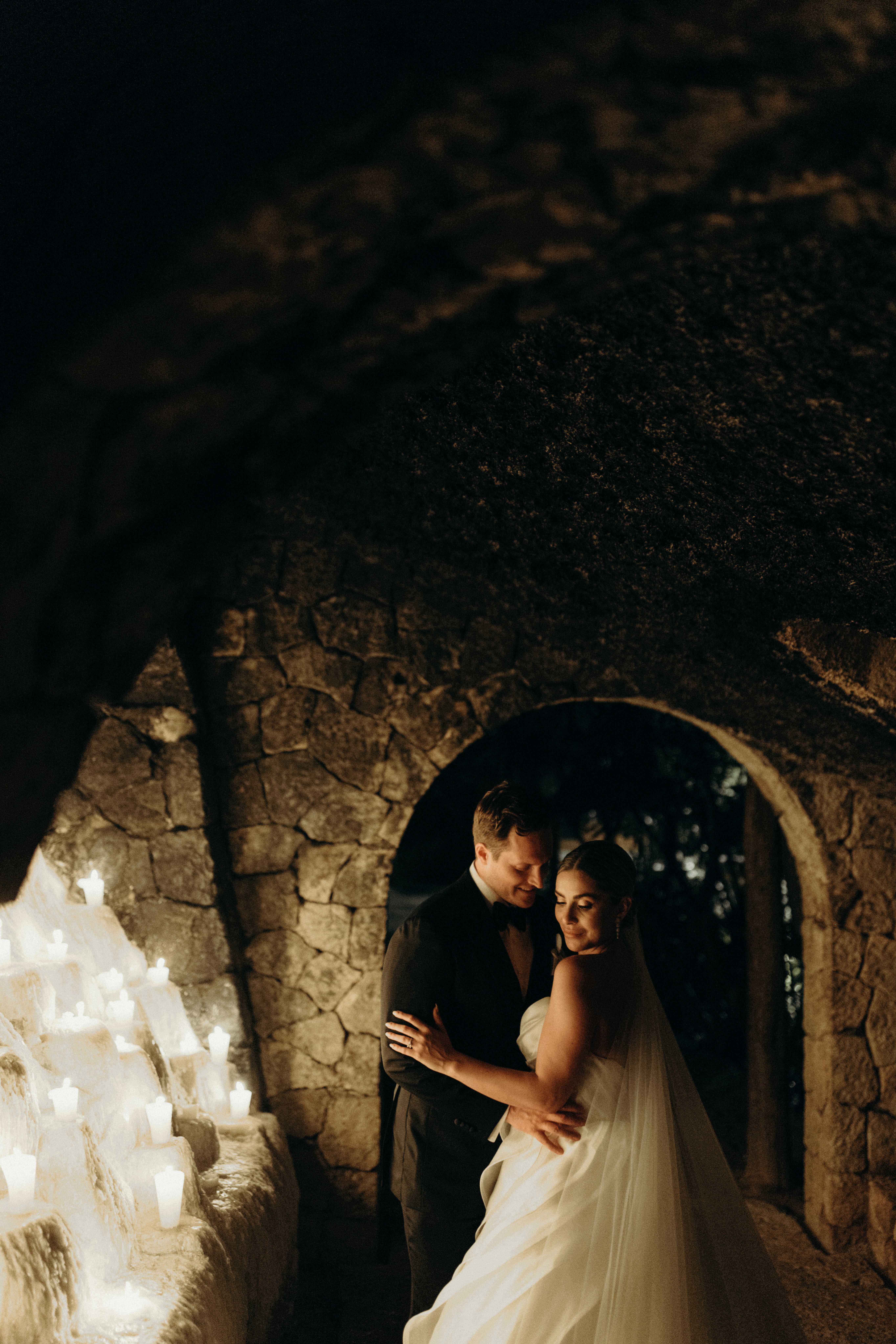 They have an amazing catholic ceremony in the top of the pyramid of the Hotel Xcaret Mexico at Todos Los Angeles Chapel, after the ceremony was finish they move the guests to Xcaret Park, at La Isla, a cave – river venue. The property have a spiral with a water and fire fountain that give the entrance to their guests, after the guests walk a glass bridge they see the break taking reception!