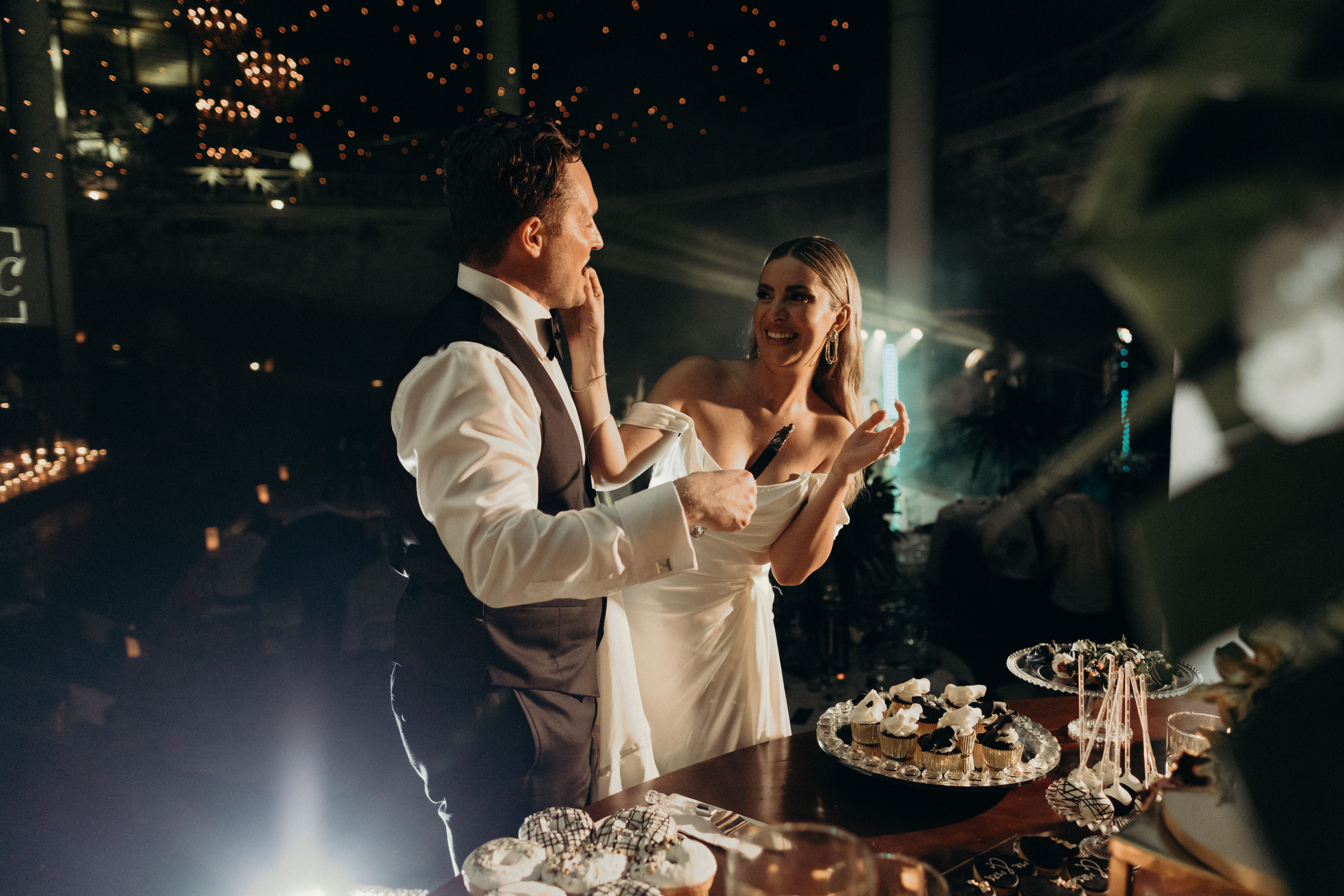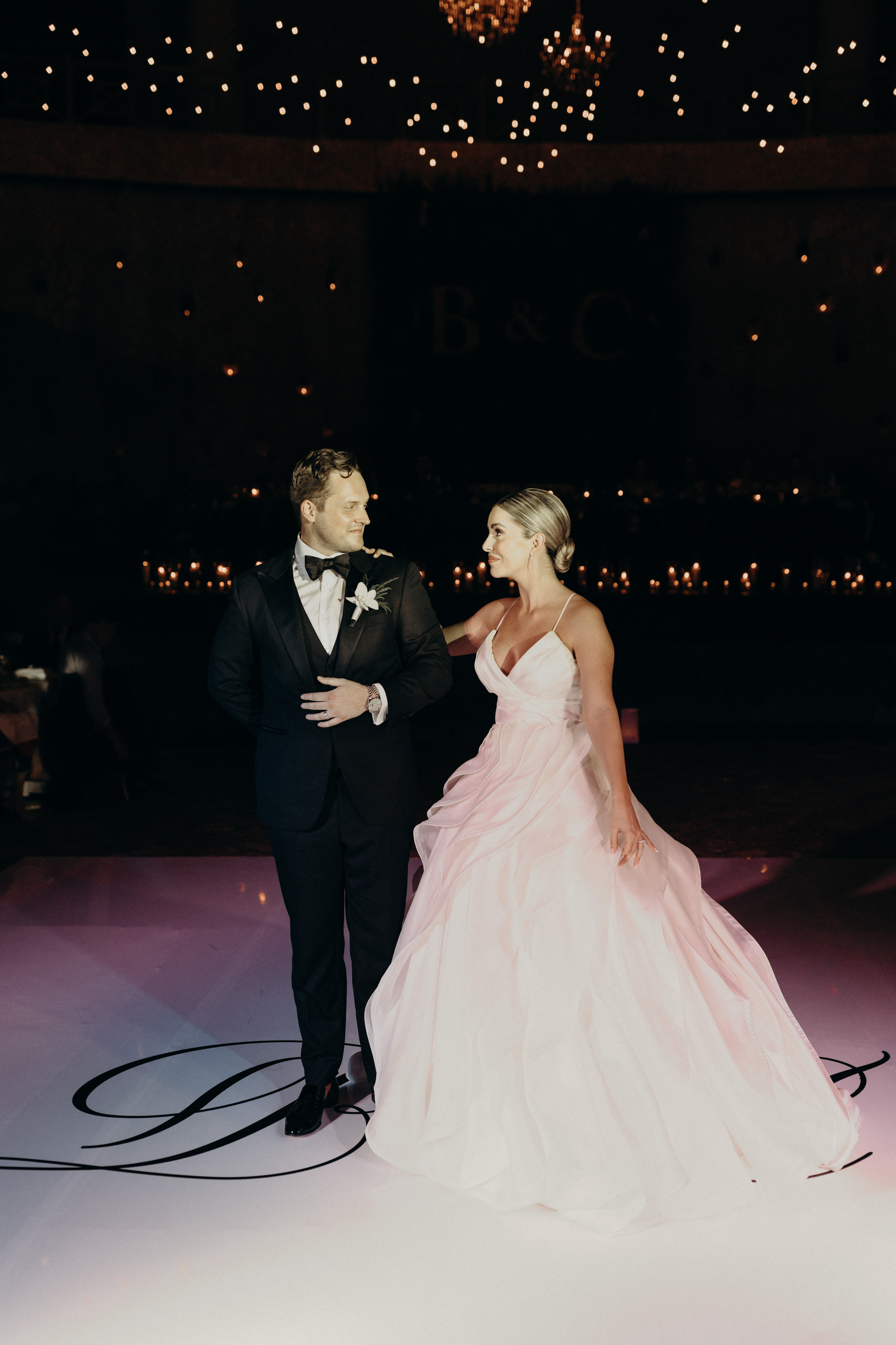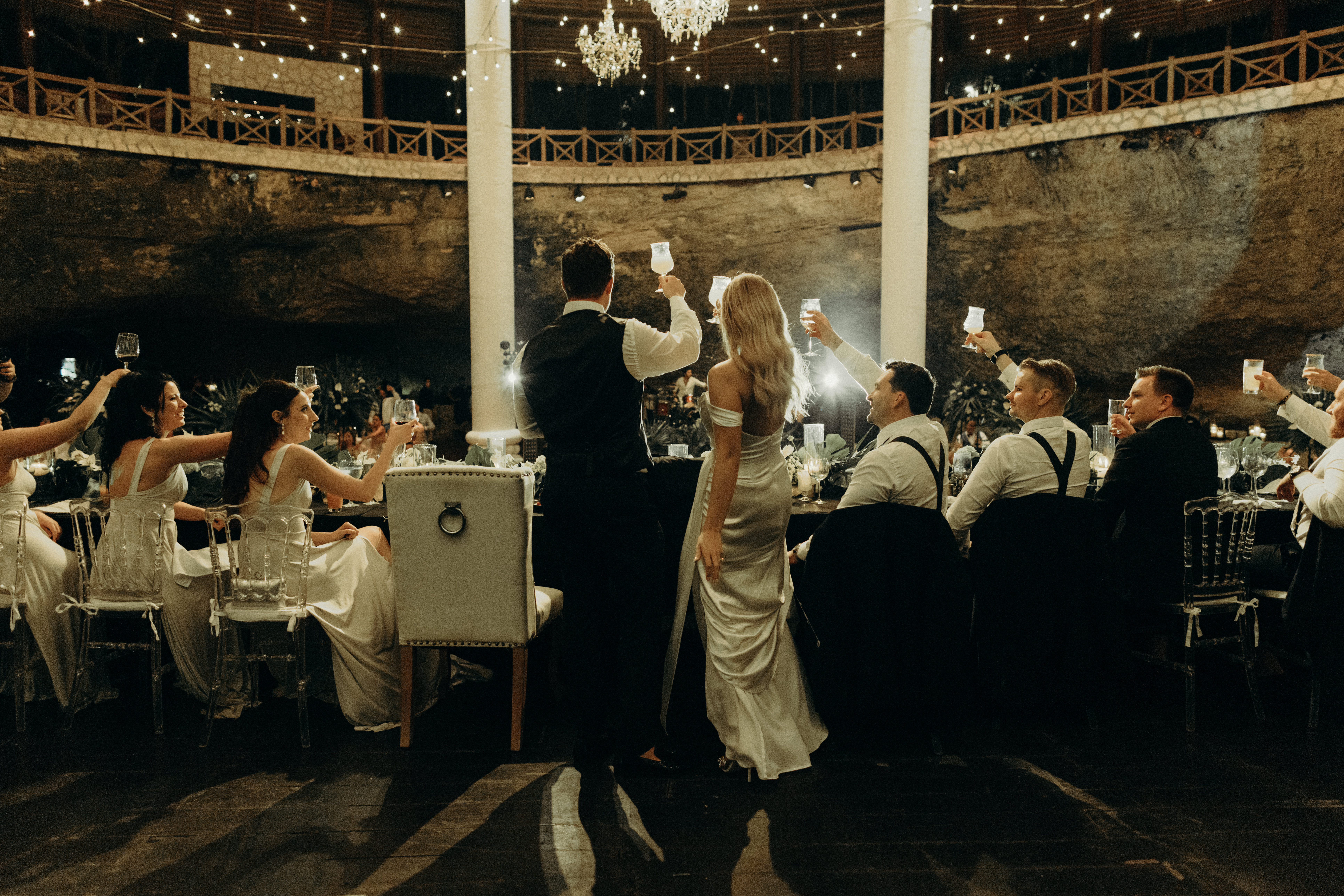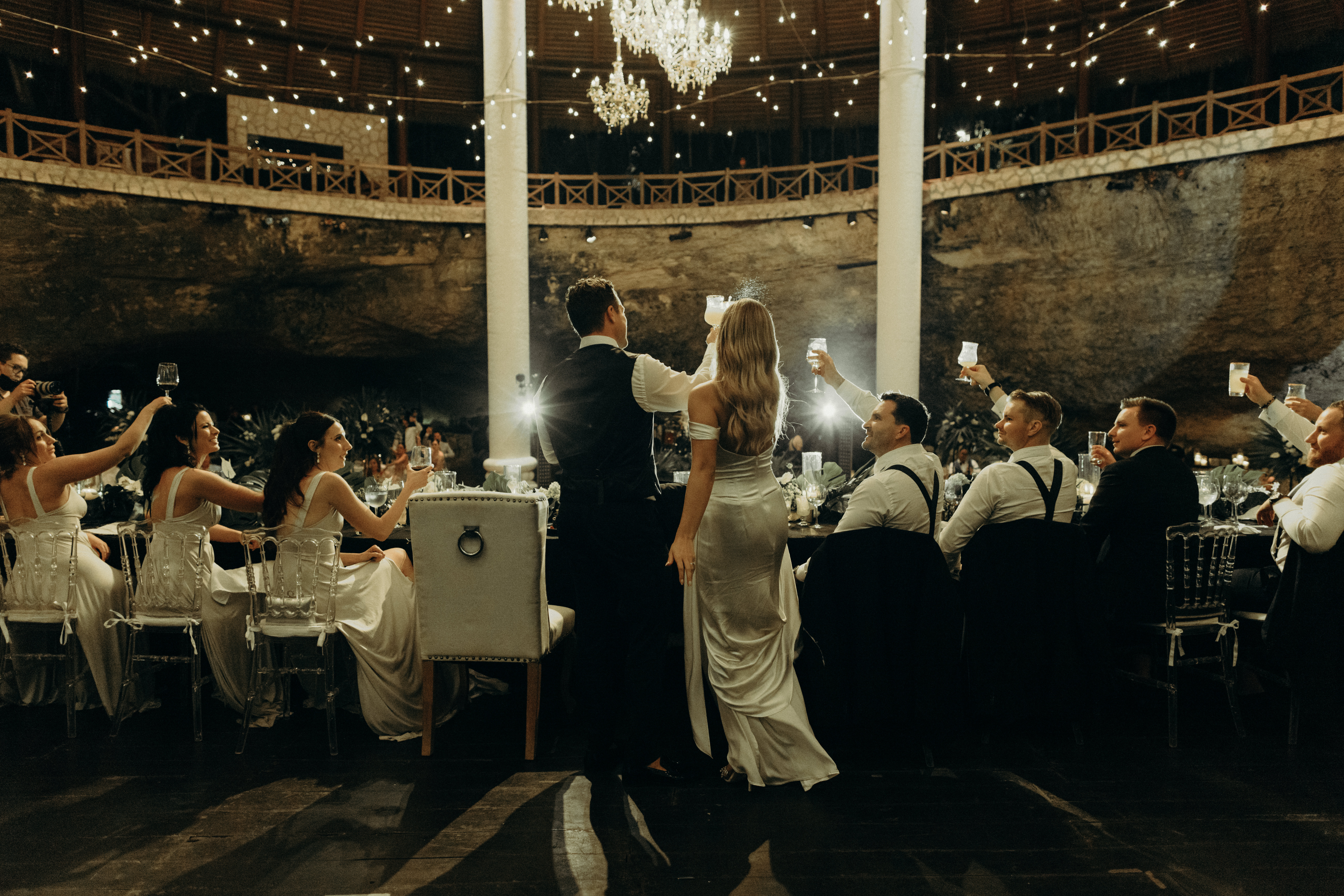 They have an amazing catholic ceremony in the top of the pyramid of the Hotel Xcaret Mexico at Todos Los Angeles Chapel, after the ceremony was finish they move the guests to Xcaret Park, at La Isla, a cave – river venue. The property have a spiral with a water and fire fountain that give the entrance to their guests, after the guests walk a glass bridge they see the break taking reception!