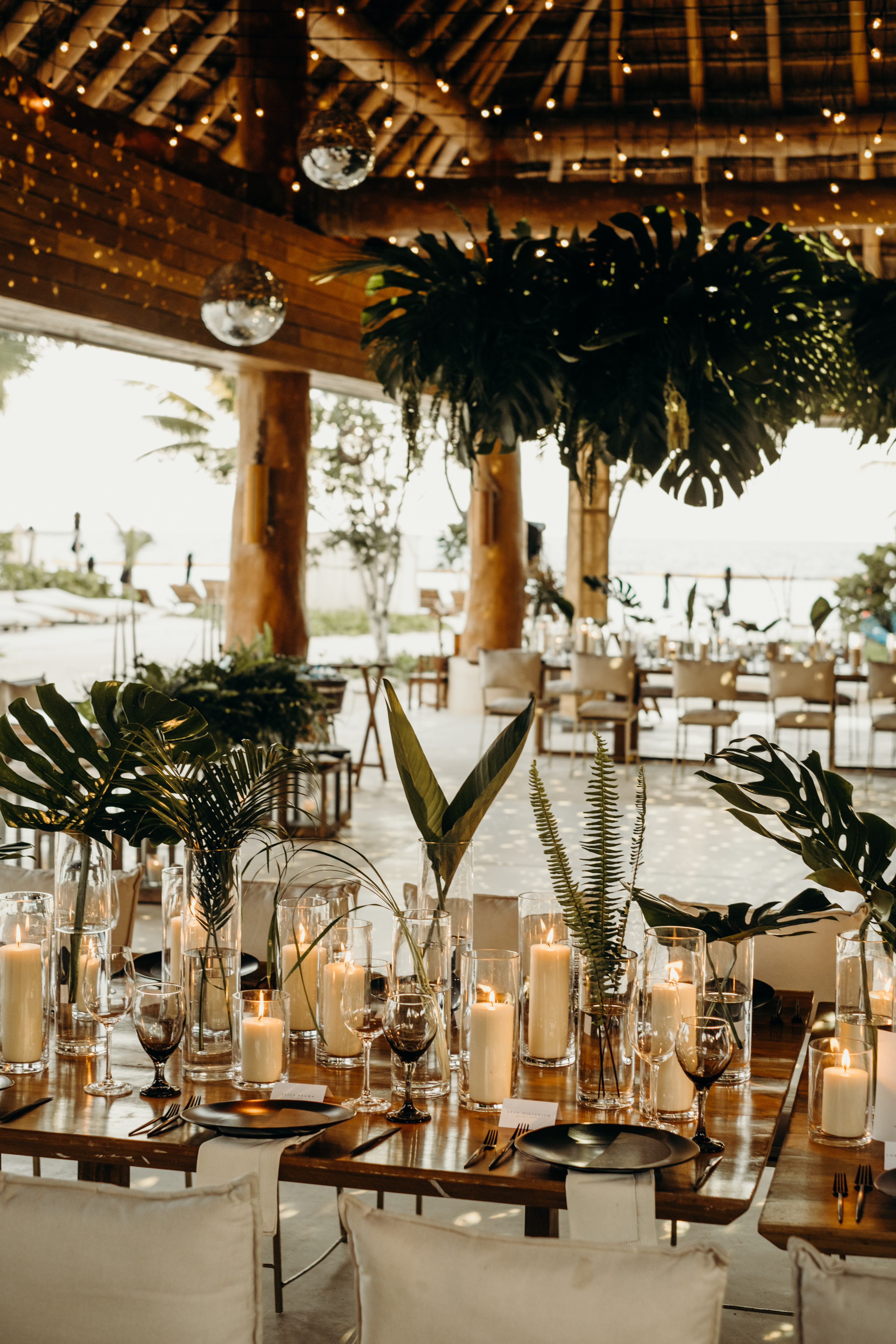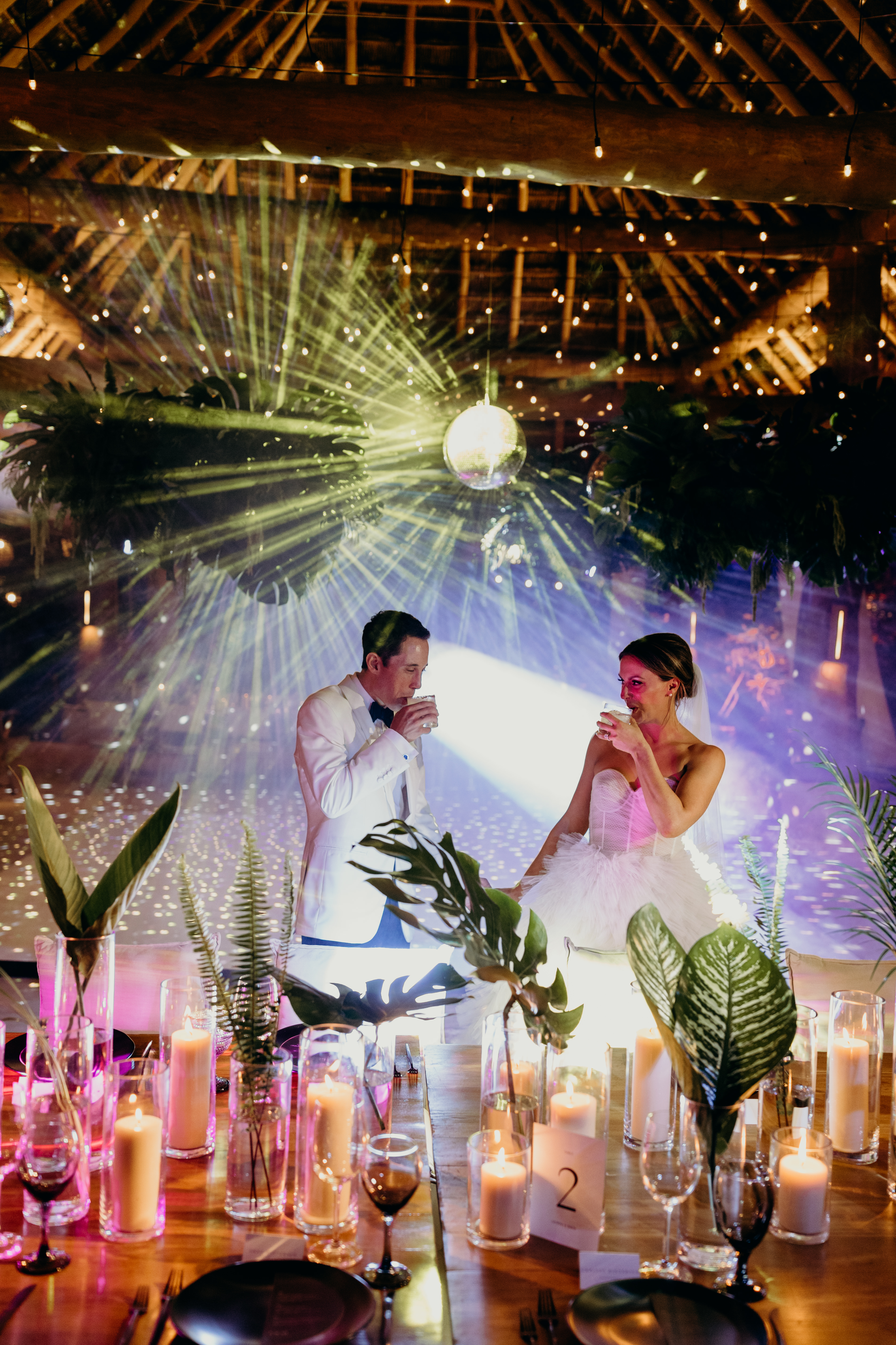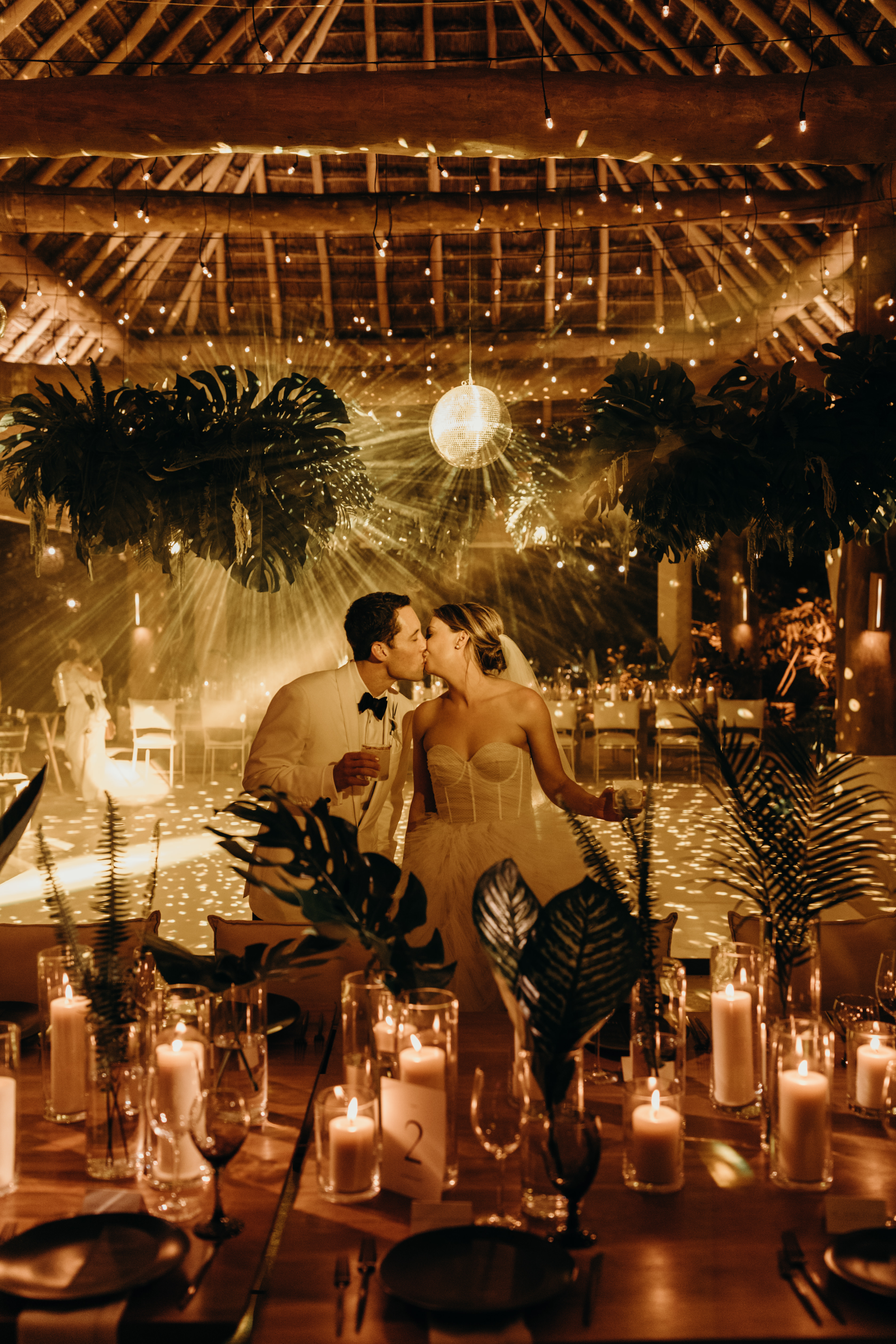 The ceremony was in the garden with partial view to the lagoon, and the Palapa “Aqui me quedo” was transformed into a beautiful reception with a lot of candles, jungles vibes, disco ball and chic dinner with full of details!