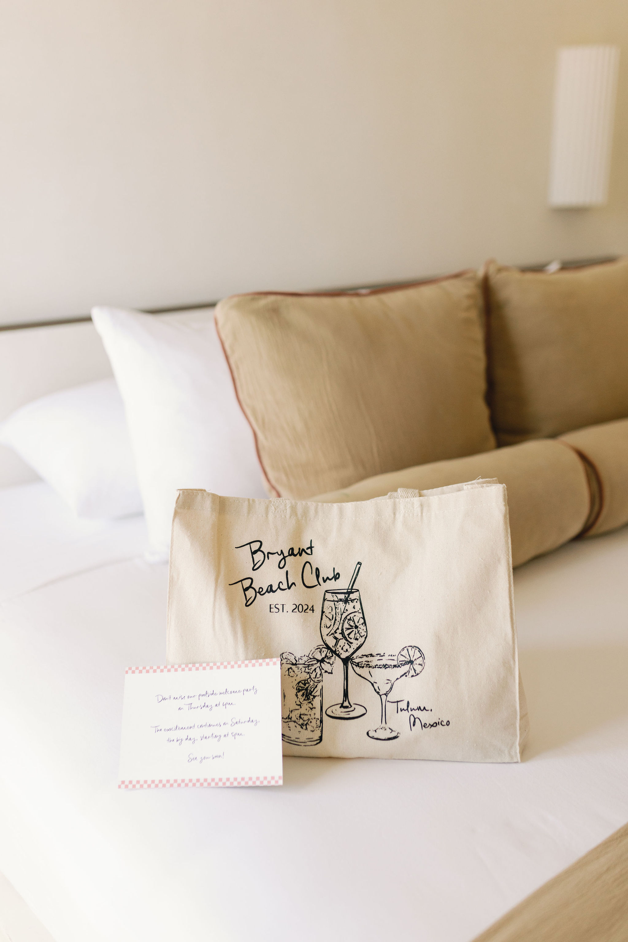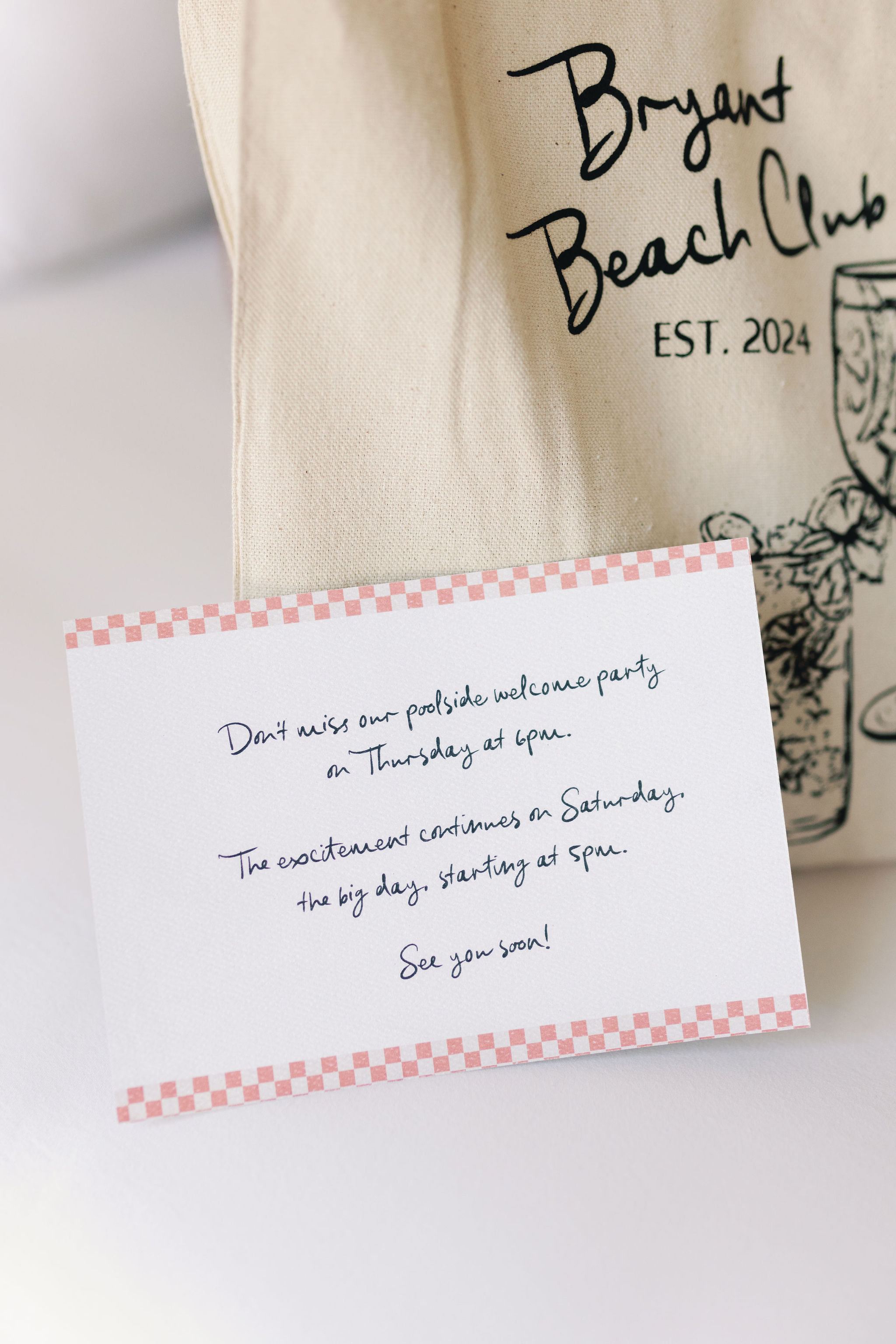 Guests were greeted with thoughtfully curated welcome bags branded with the “Bryant Beach Club” logo, setting the tone for a weekend full of fun and celebration. Inside, a beautifully handwritten note invited everyone to join the festivities and hinted at the excitement to come on the big day.