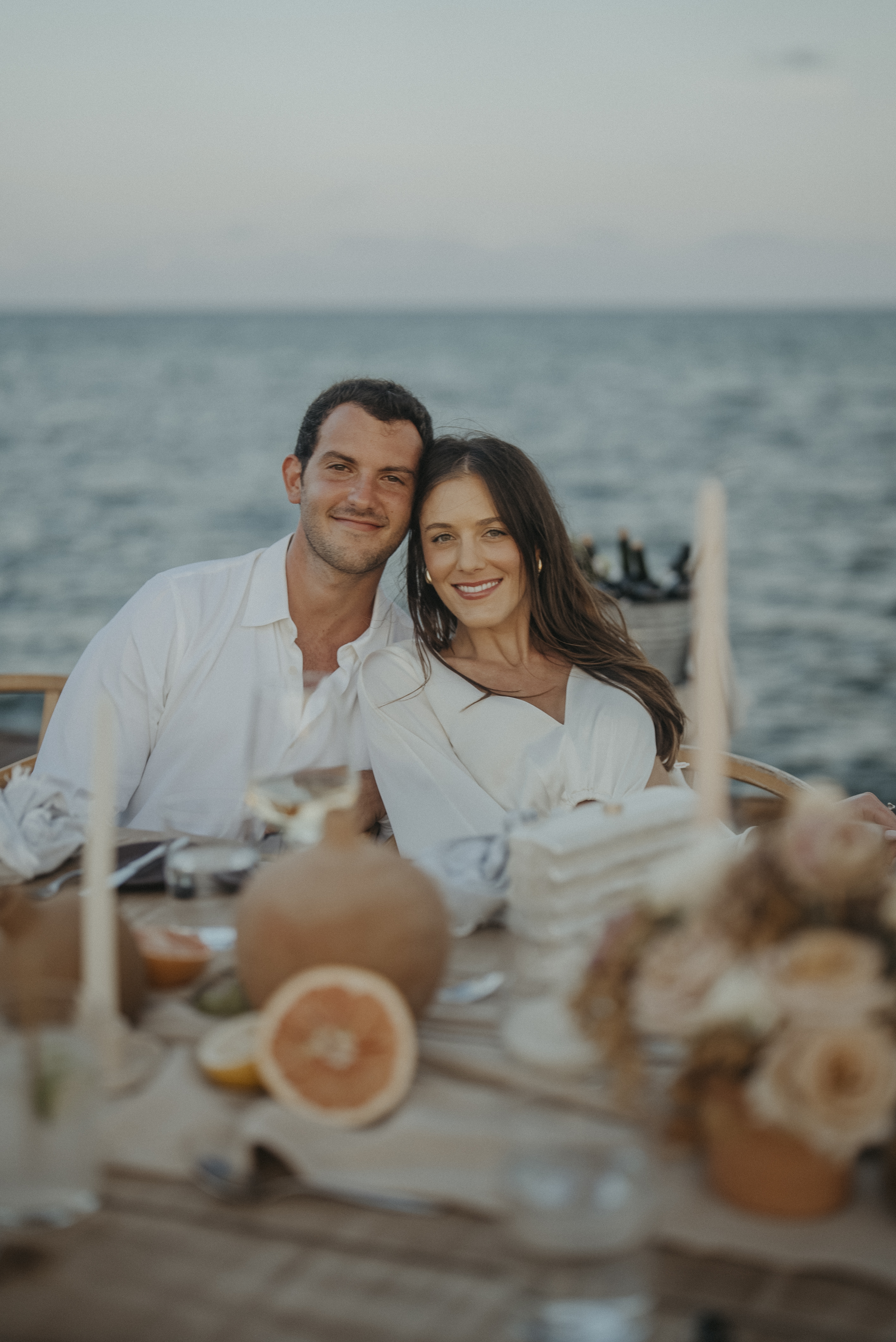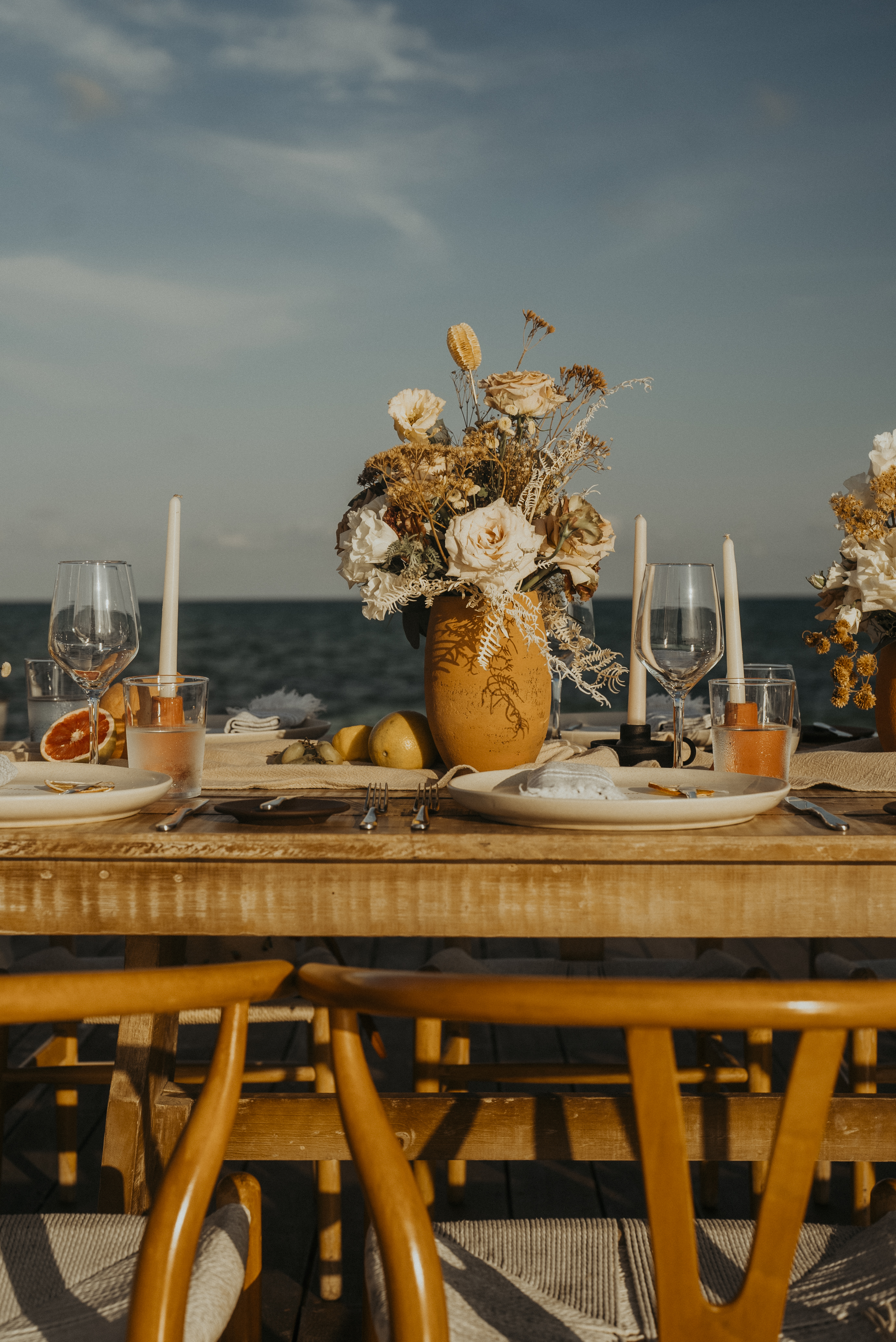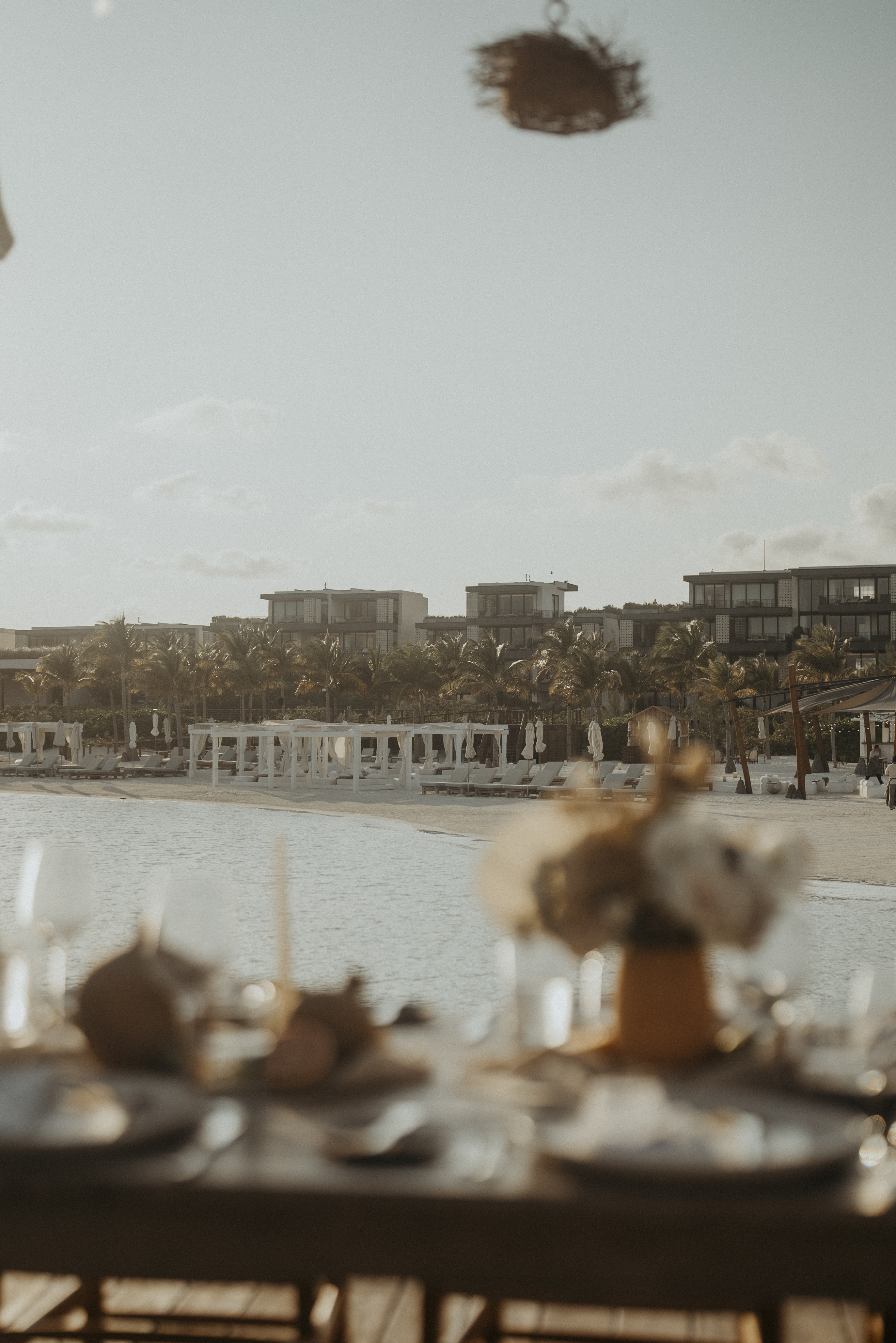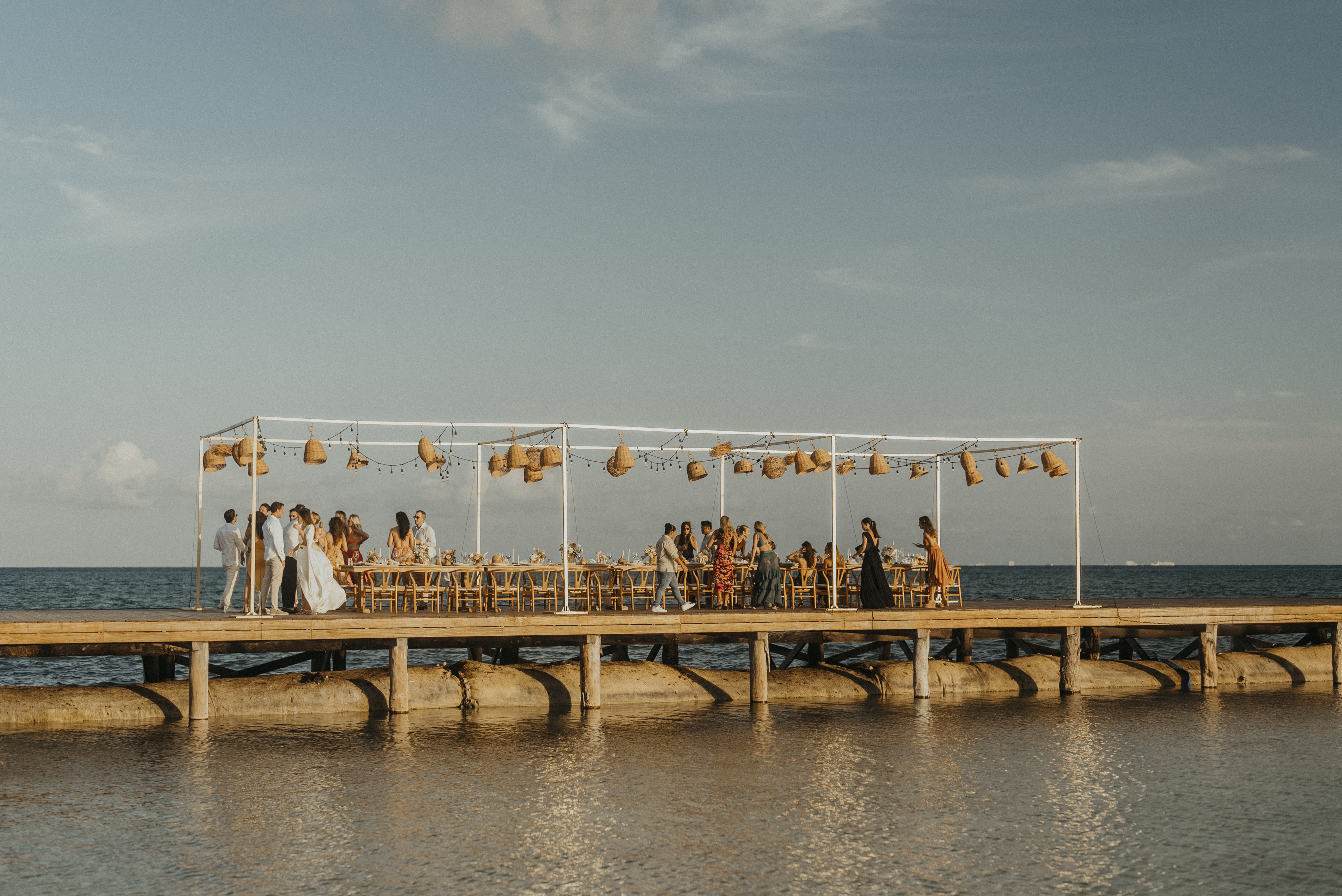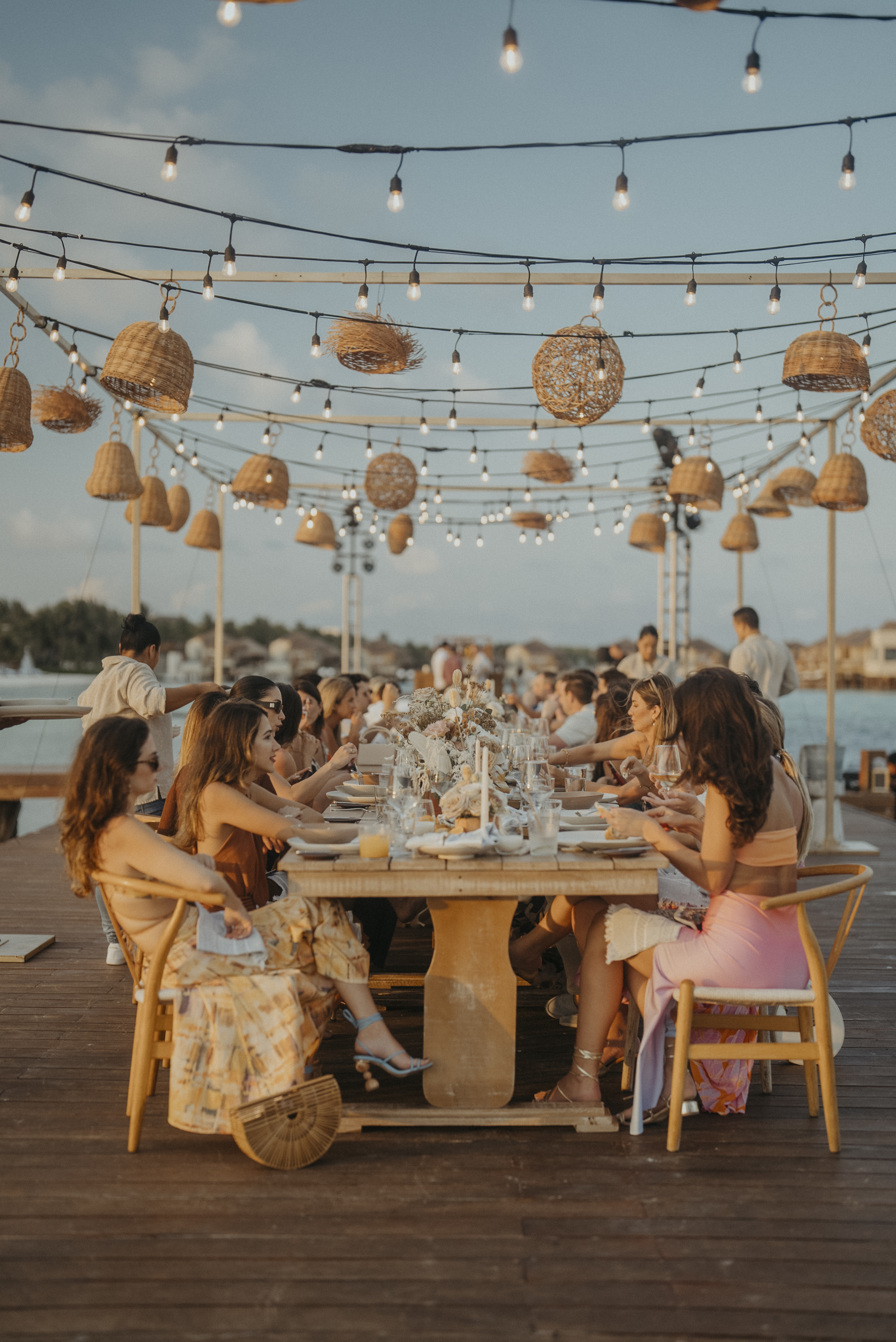 In an event of 2 days, day one instead of having a ceremony, their prefect to have an intimated and lovely dinner at the Deck in the middle on the ocean. Etéreo food and beverage team have a lovely costumed plated dinner, that the guests can have their selection. With a totally chill and chic decor that match with the entire ambience of the property, the guests have a great time. We build an structure to make sure with have string lights and lamps having from the top of the tables, created and an warmer ambience.
